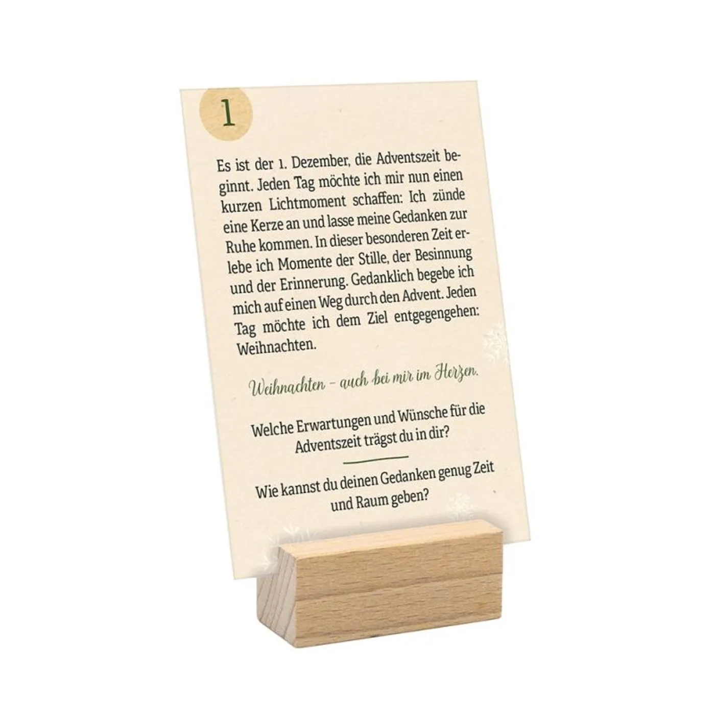 Die Karten sind jeweils doppelseitig bedruckt. Auf der Vorderseite gibt es stets ein sehr stimmungsvolles Advents- bzw. Weihnachtsmotiv mit einem Motto. Auf der Rückseite finden sich Gedanken der Autorin zum Motto oder auch Gedichte und Liedtexte. Allesamt regen zum Nachdenken und zum Innehalten an. In den Holzaufsteller gesteckt, hat man sogar eine täglich wechselnde Dekoration.