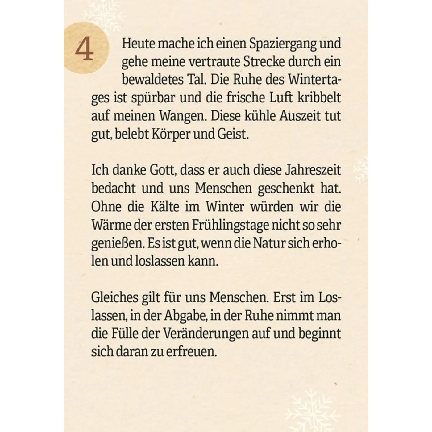 Dieser kleine Adventskalender beinhaltet 24 gute Wünsche und Gedanken. Ob ein Gedicht, eine Frage oder ein herausforderndes Wort, jeden Tag gibt es einen kurzen Text.