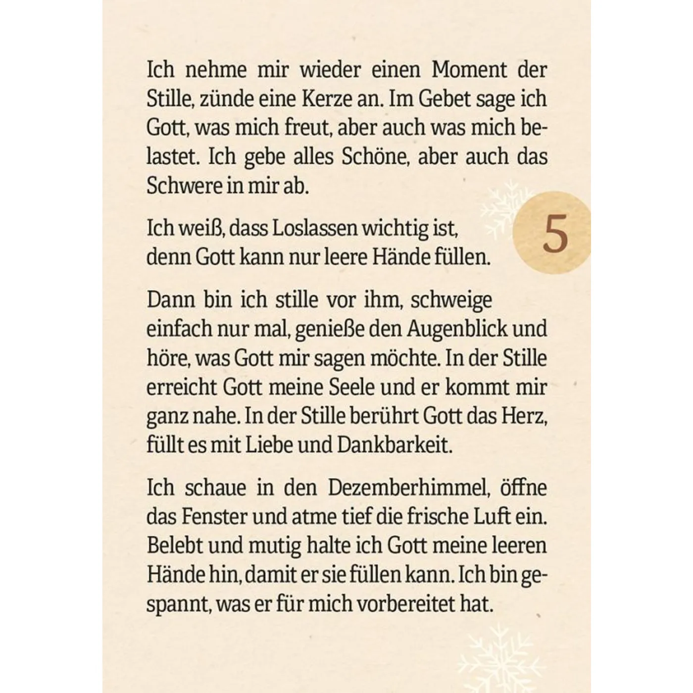 Jedes nummerierte Kärtchen hat vorne ein weihnachtliches Motiv, meistens Dekogegenstände oder Wintermotive. Hier hätte ich mir persönlich manchmal eine modernere Motivauswahl gewünscht, wobei dies natürlich ein sehr individueller Aspekt ist. Auf der Rückseite stehen inspirierende Texte, tiefsinnige Gedankengänge, persönliche Fragen und auch besinnliche Lieder, die den Betrachter innehalten lassen.