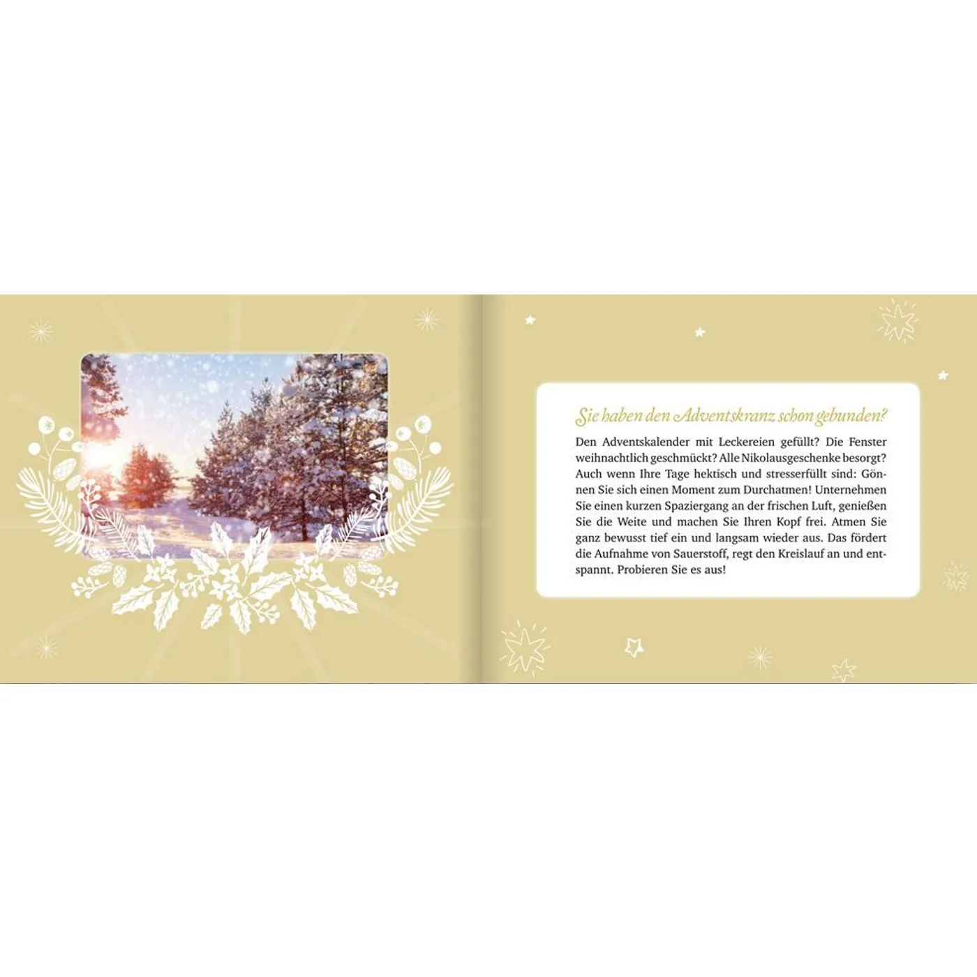Momente zum Innehalten - Das Adventskalenderbuch mit Seiten zum Auftrennen: Der Advent ist zwar eine wunderschöne Zeit, allerdings leider auch eine sehr stressige. In diesem kleinen Büchlein finden sich 24 Momente zum Innehalten, damit man die Vorweihnachtszeit so richtig genießen kann.