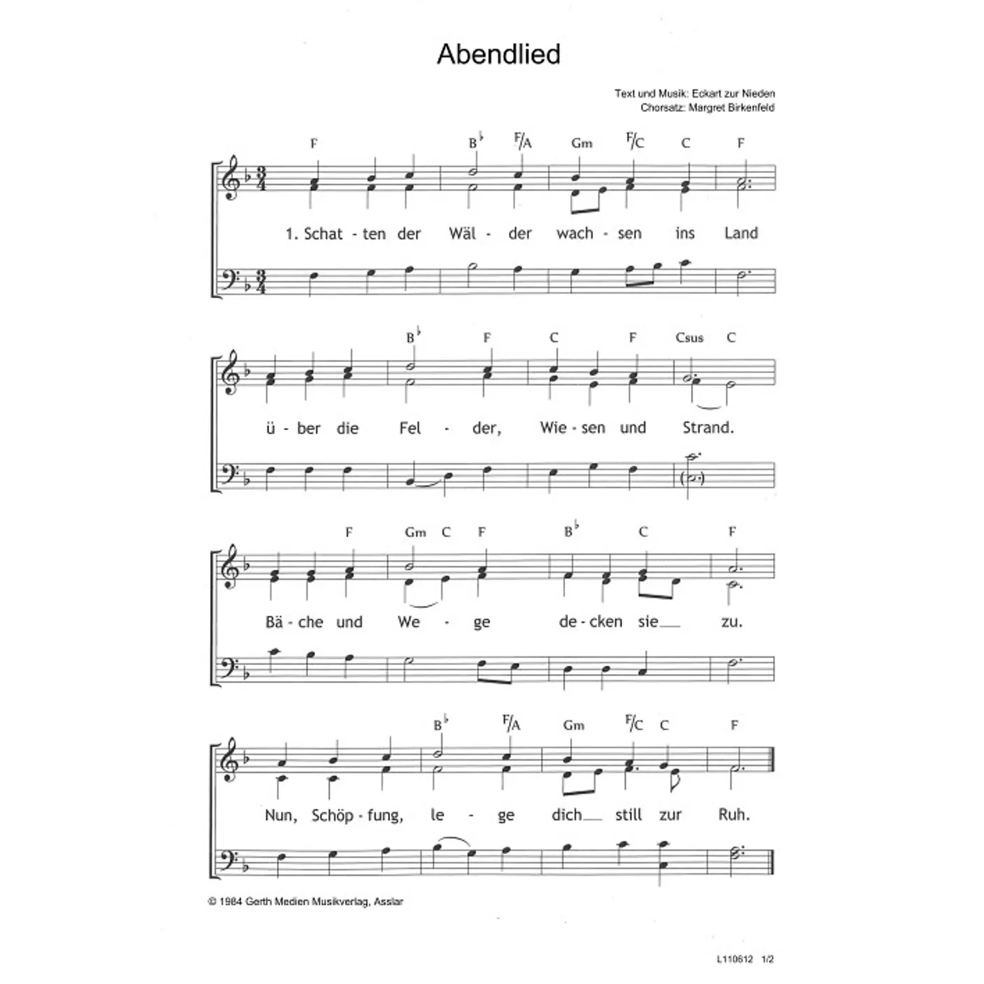 Abendlied (diese Variante haben Sie gerade ausgewählt) (Kinderchor, gemischter Chor, mit Akkorden, vierstimmig, F-Dur) Eckart zur Nieden (Komposition, Text), Margret Birkenfeld (Chorsatz) |