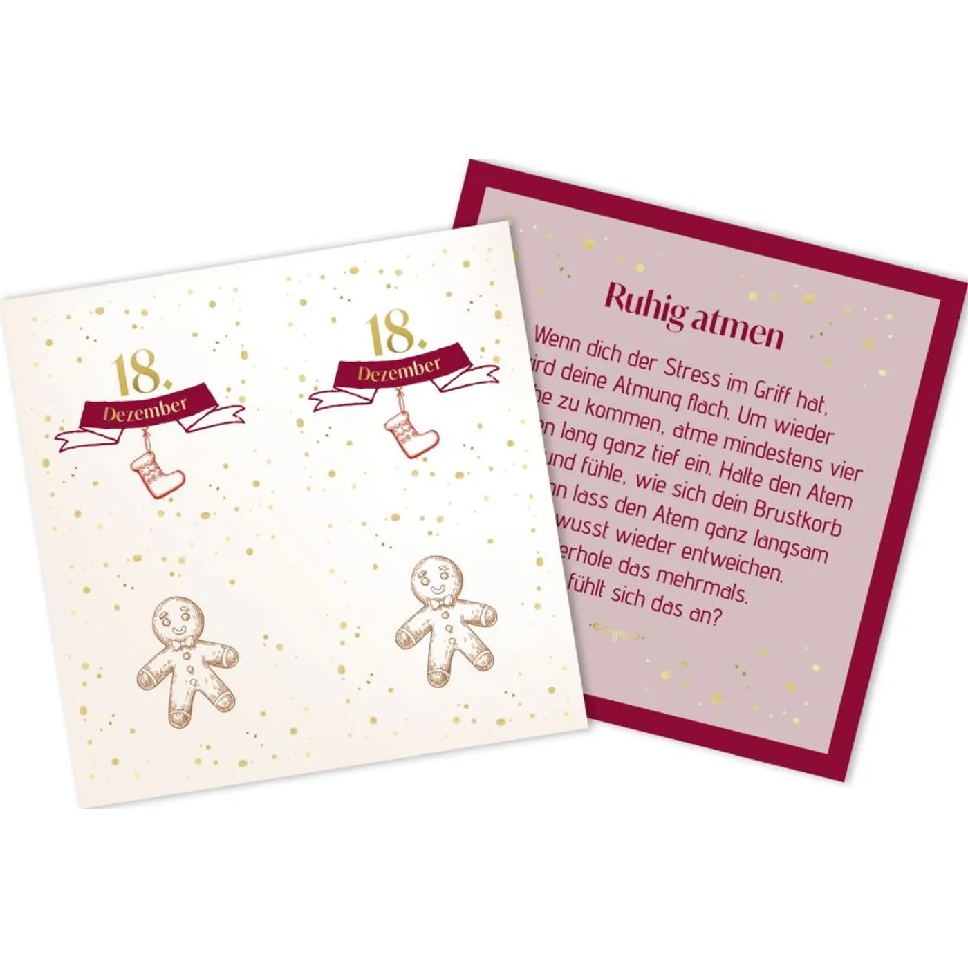 Diese Adventskalender-Box schenkt kleine Achtsamkeits-Momente: Die 24 gefalteten Zettelchen enthalten Tipps, Inspirationen und einfache Übungen wie eine Mini-Meditation, Atem- oder die Rosinen-Übung. Sie helfen dabei, zwischendurch innezuhalten und loszulassen. So kann man die Tage bis Weihnachten bewusster wahrnehmen und genießen.