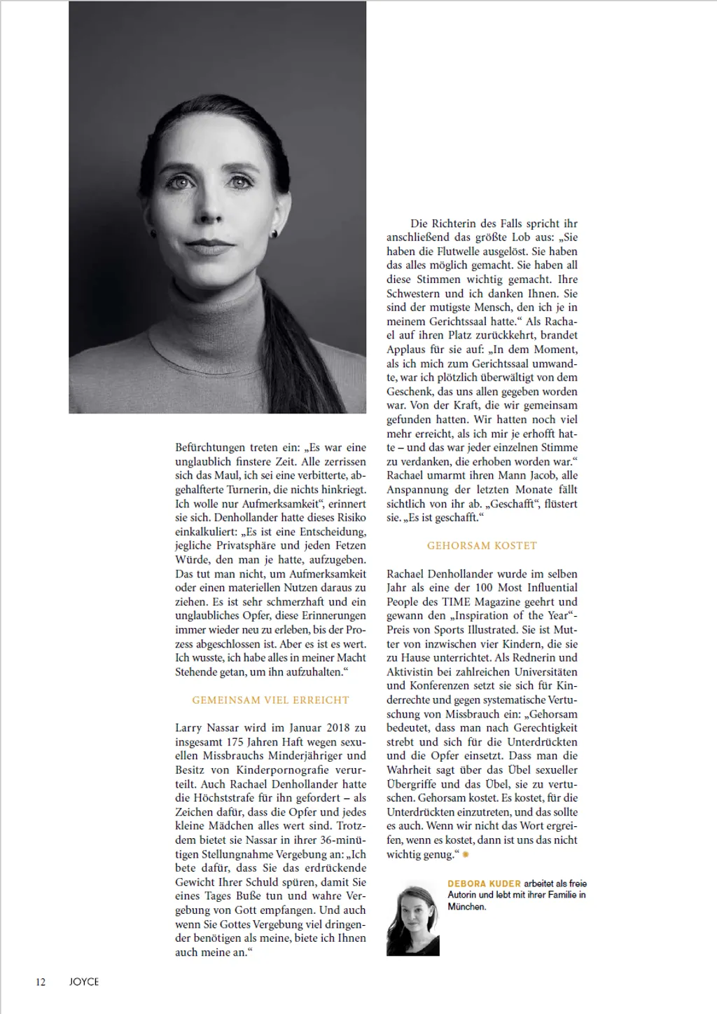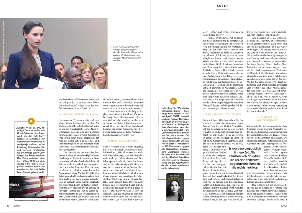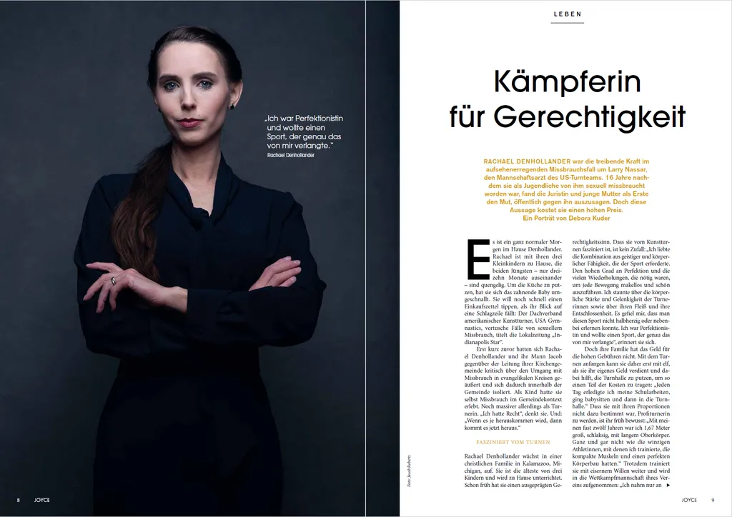 Rachael Denhollander ist Anwältin, Interessenvertreterin und Referentin, die international als die erste Frau bekannt wurde, die an die Öffentlichkeit ging, nachdem sie Larry Nassar, den ehemaligen Mannschaftsarzt von USA Gymnastics und einen der schlimmsten bekannten Sexualstraftäter der Geschichte, bei der Polizei angezeigt hatte. Infolge ihres Aktivismus gaben sich daraufhin über zweihundertfünfzig Frauen als Opfer von Nassars Missbrauch zu erkennen, was zu einer lebenslangen Haftstrafe für ihn führte.