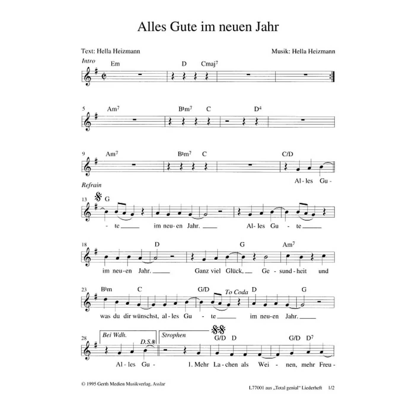 Alles Gute im neuen Jahr (diese Variante haben Sie gerade ausgewählt) (einstimmig, mit Akkorden, E-Moll) Hella Heizmann (Komposition, Text) |