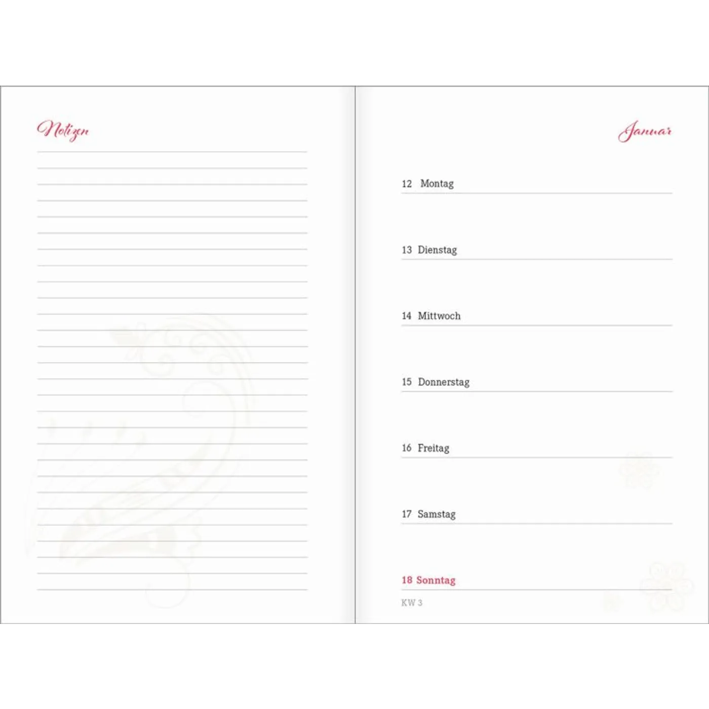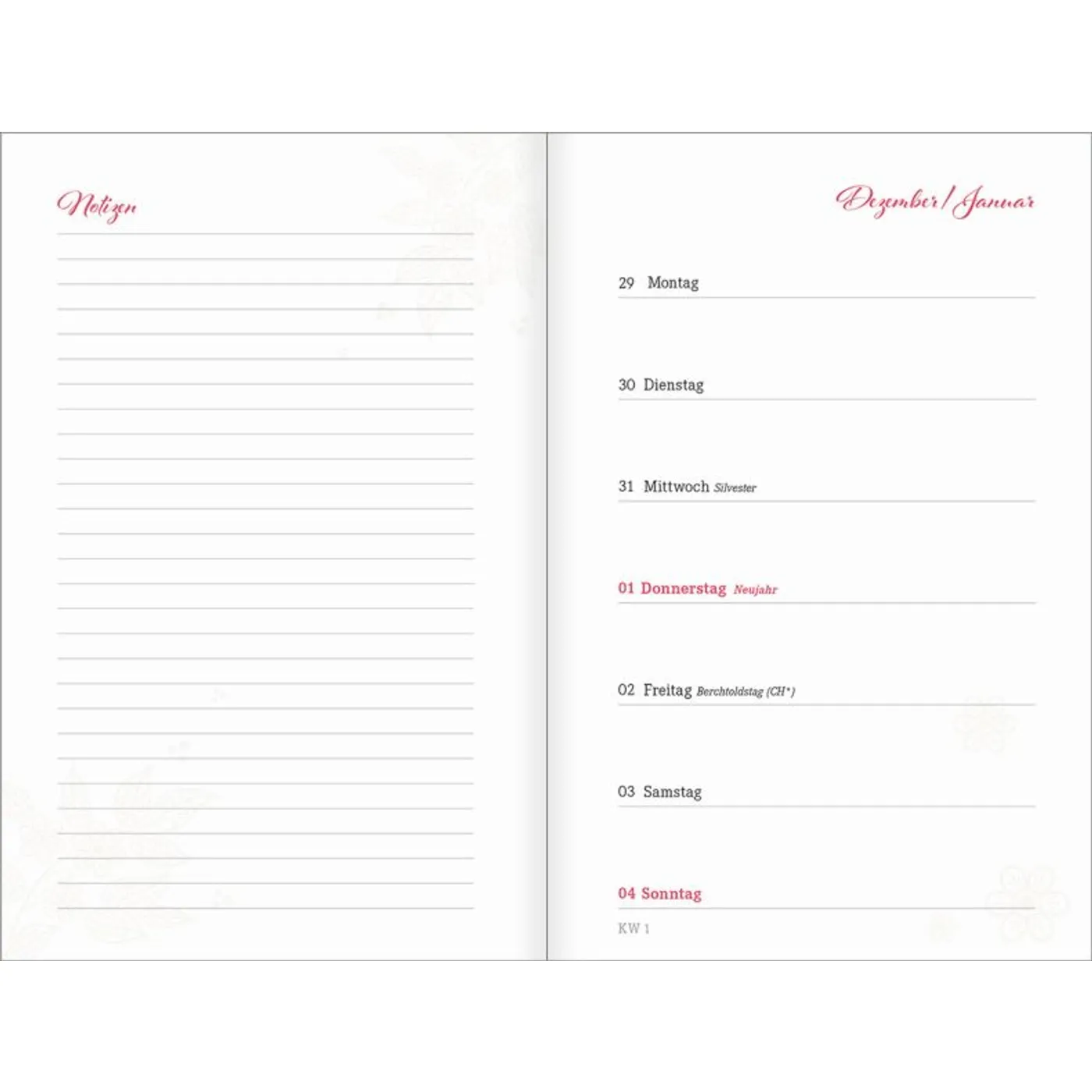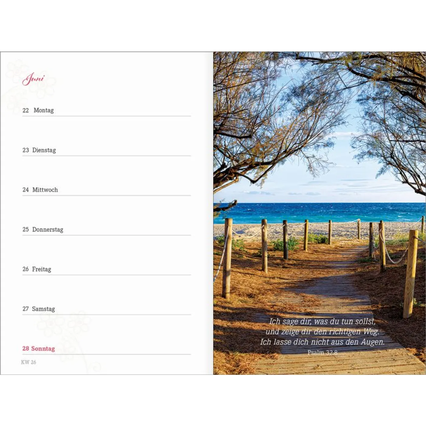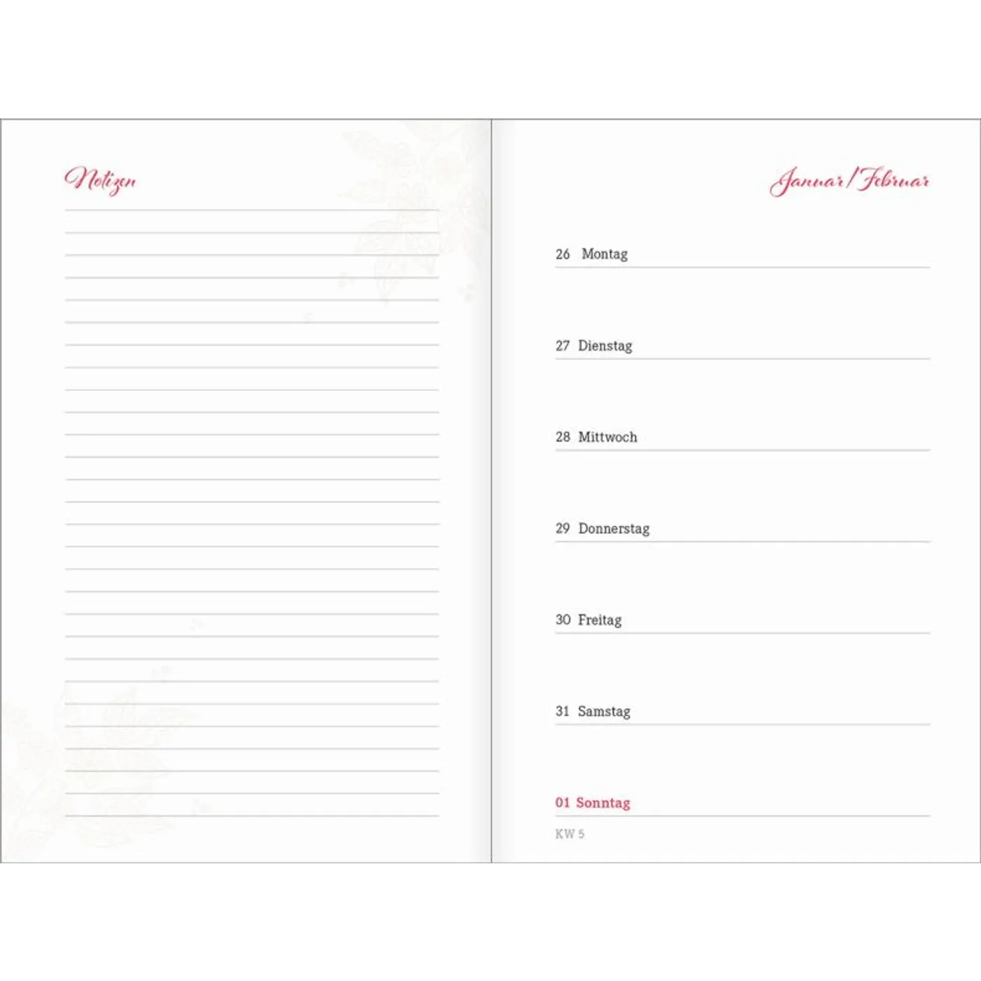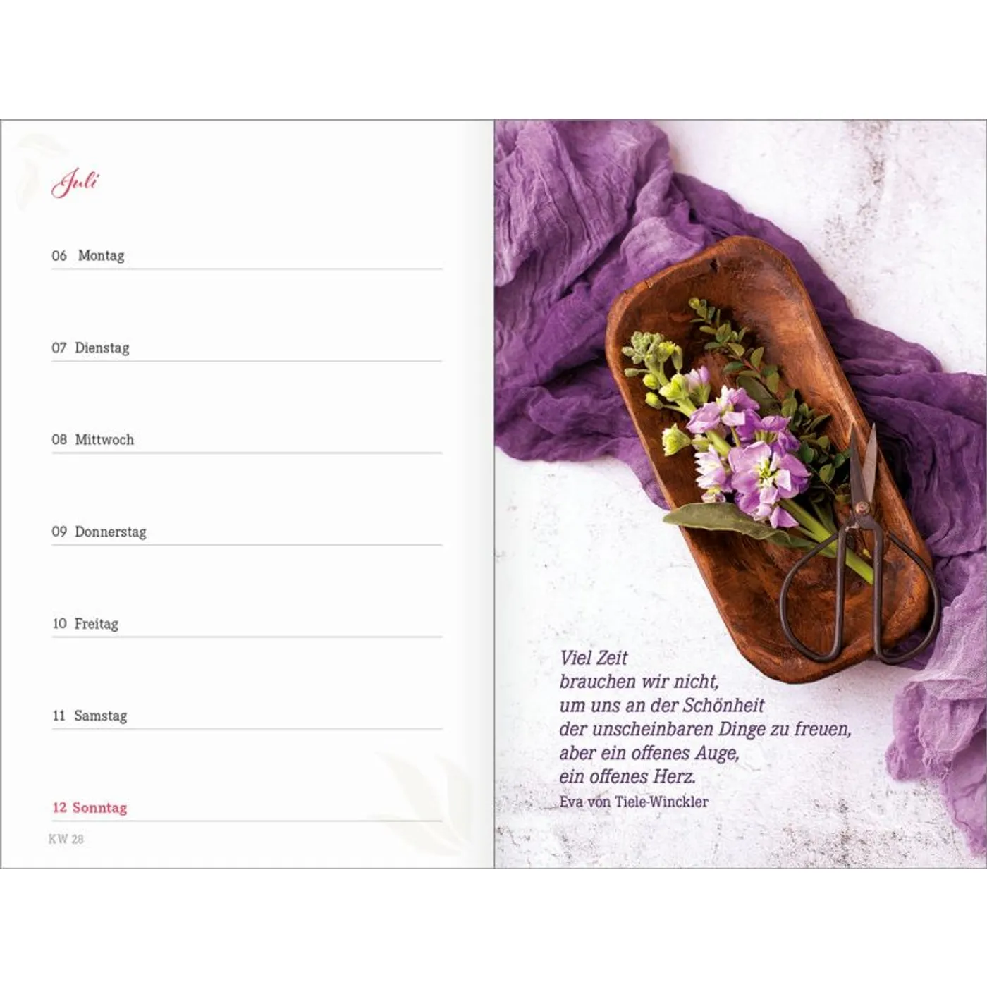 1 Woche auf einer Seite, vierfarbig, mit 2 Lesebändchen und Gummiband