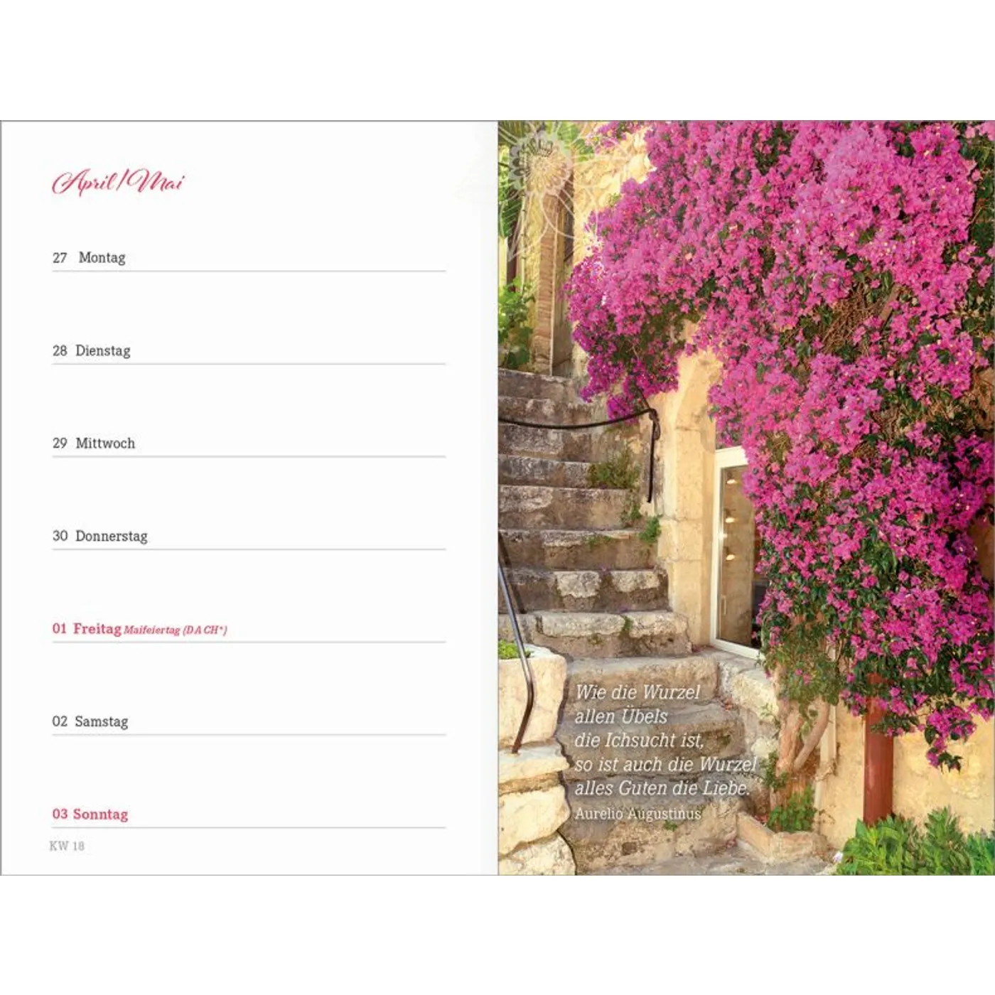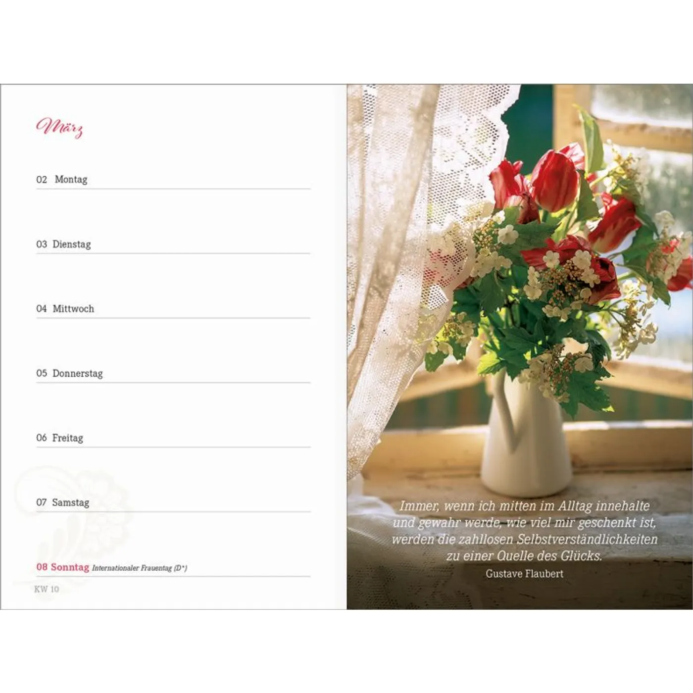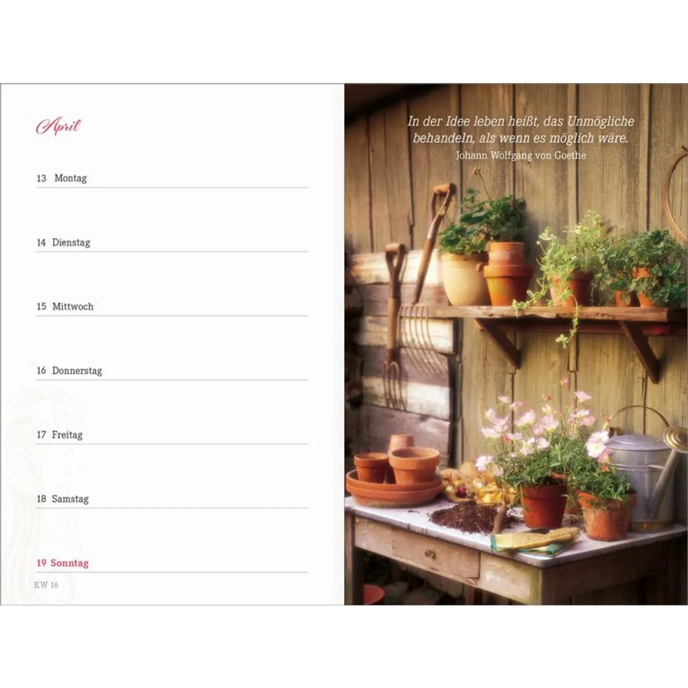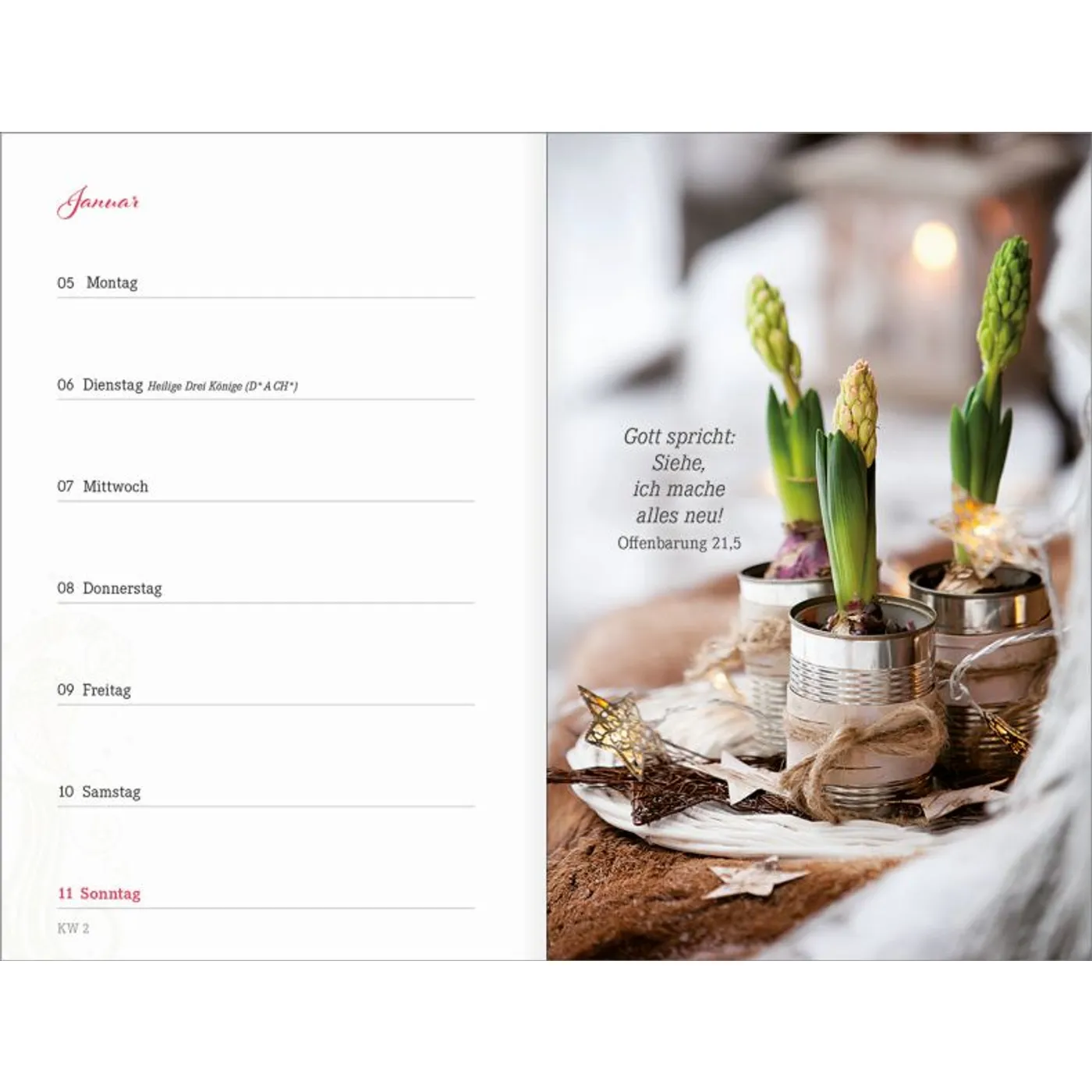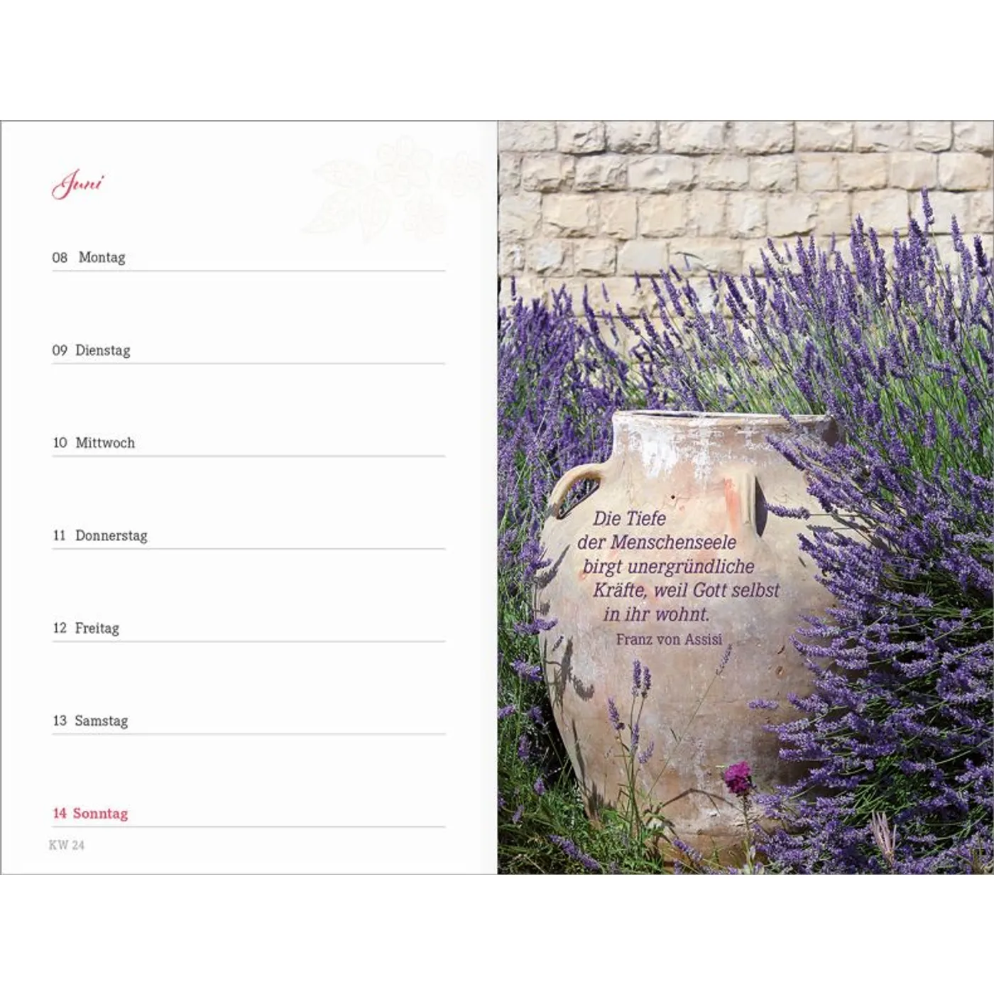 1 Woche auf einer Seite, vierfarbig, mit 2 Lesebändchen und Gummiband