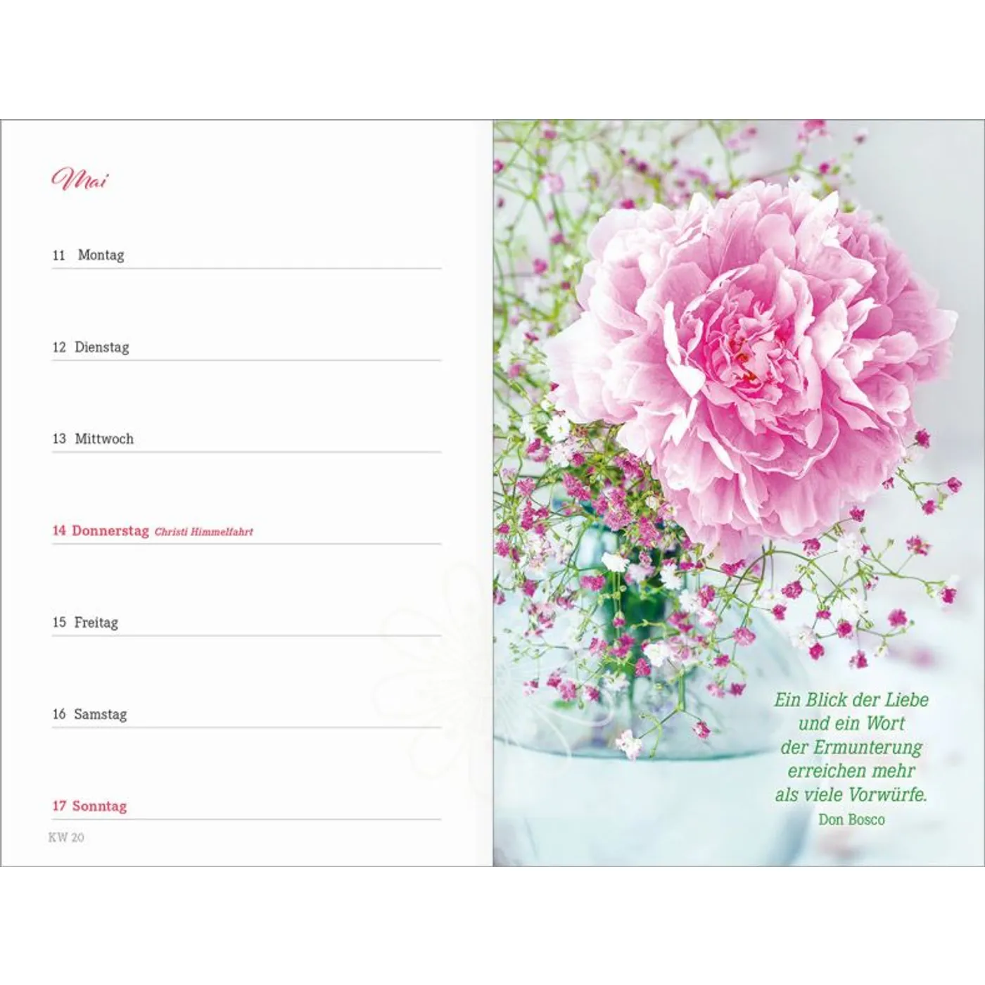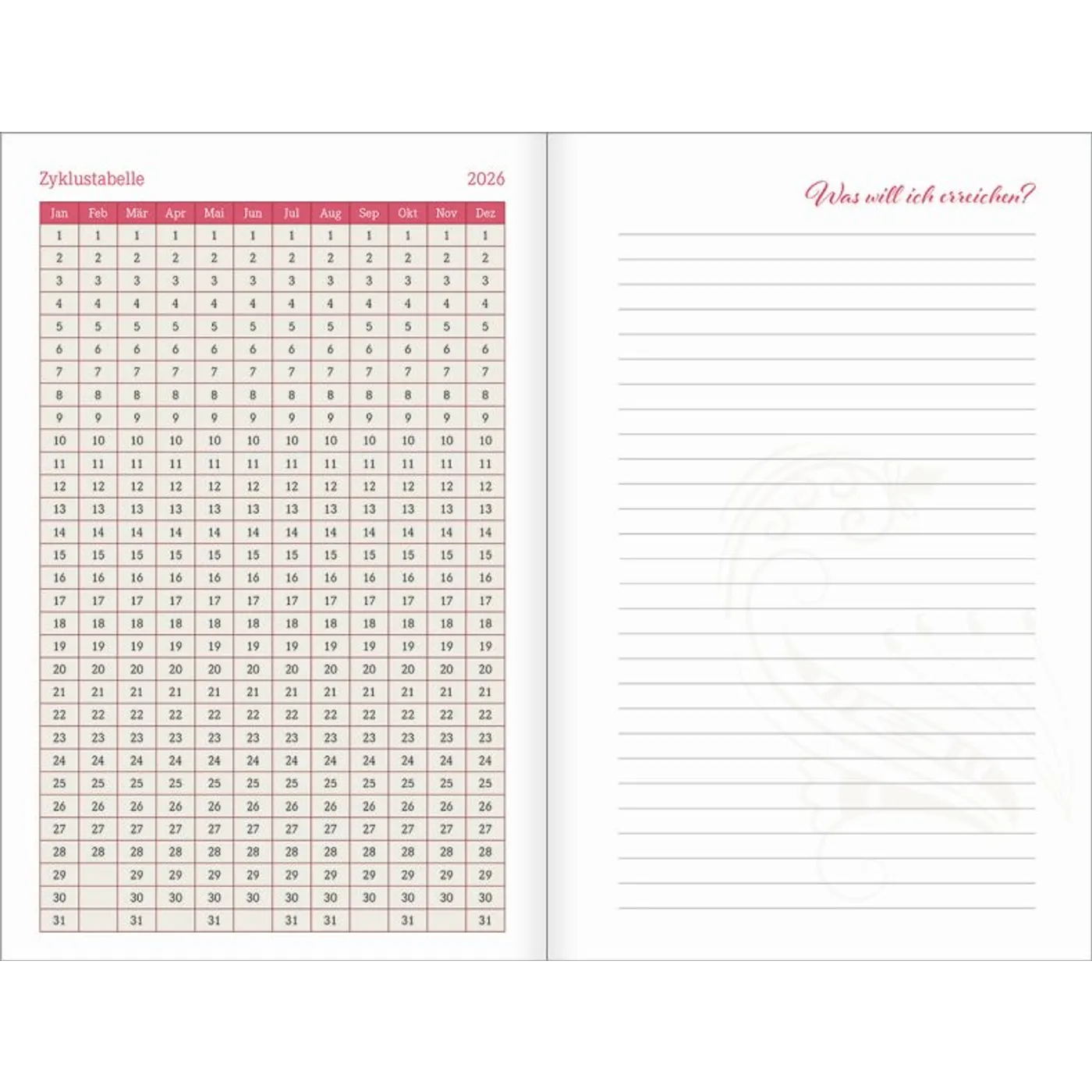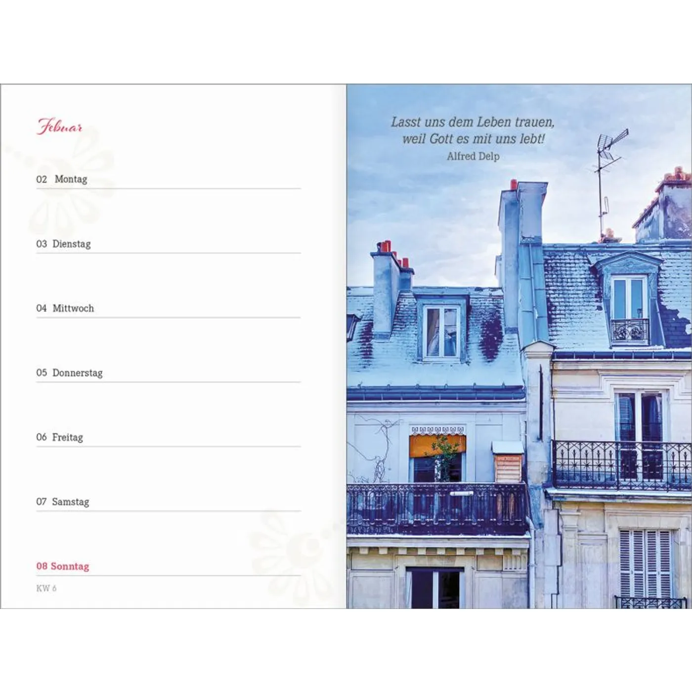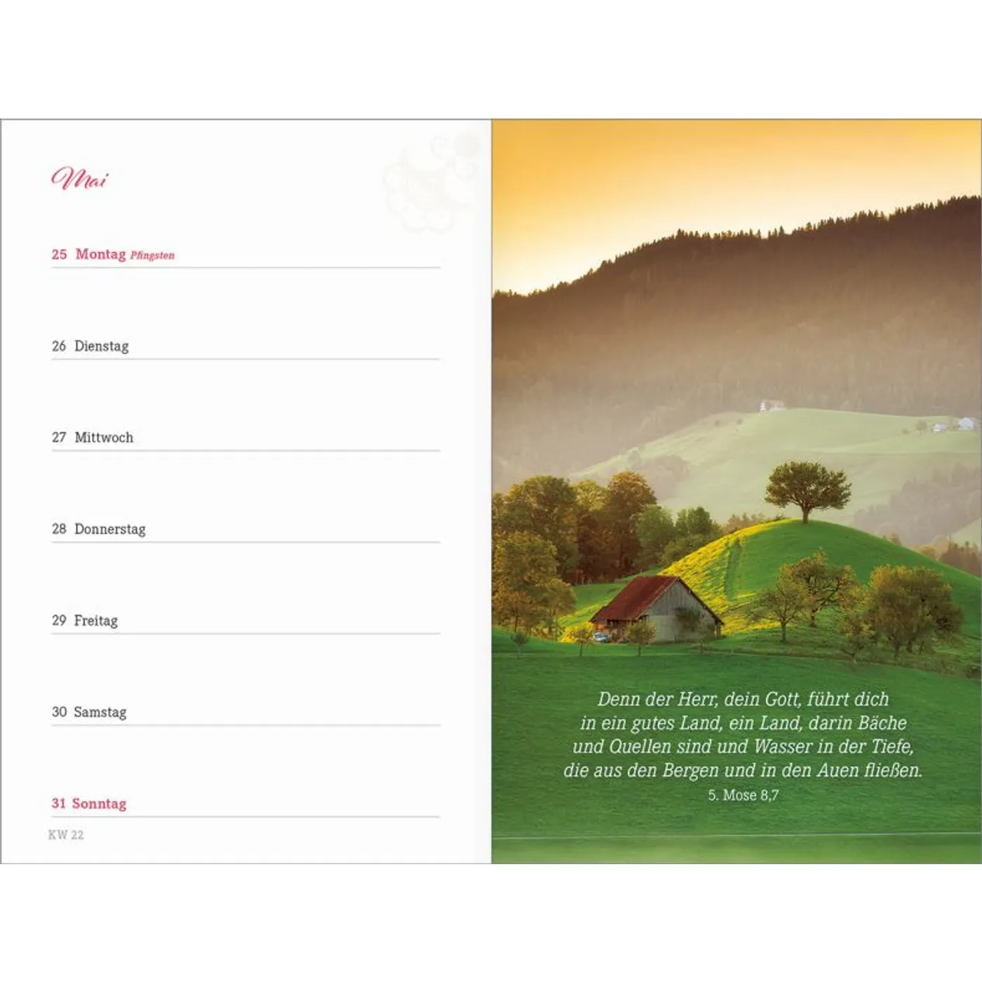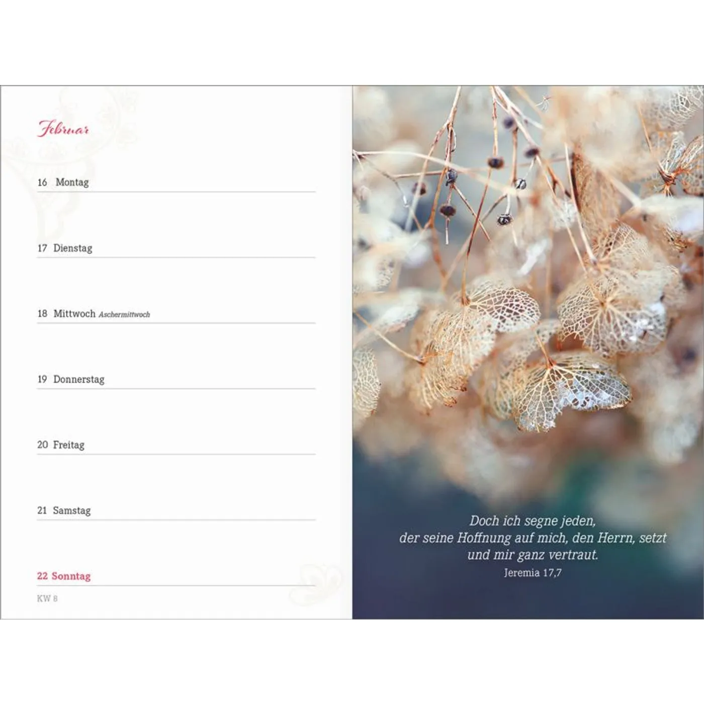 1 Woche auf einer Seite, vierfarbig, mit 2 Lesebändchen und Gummiband