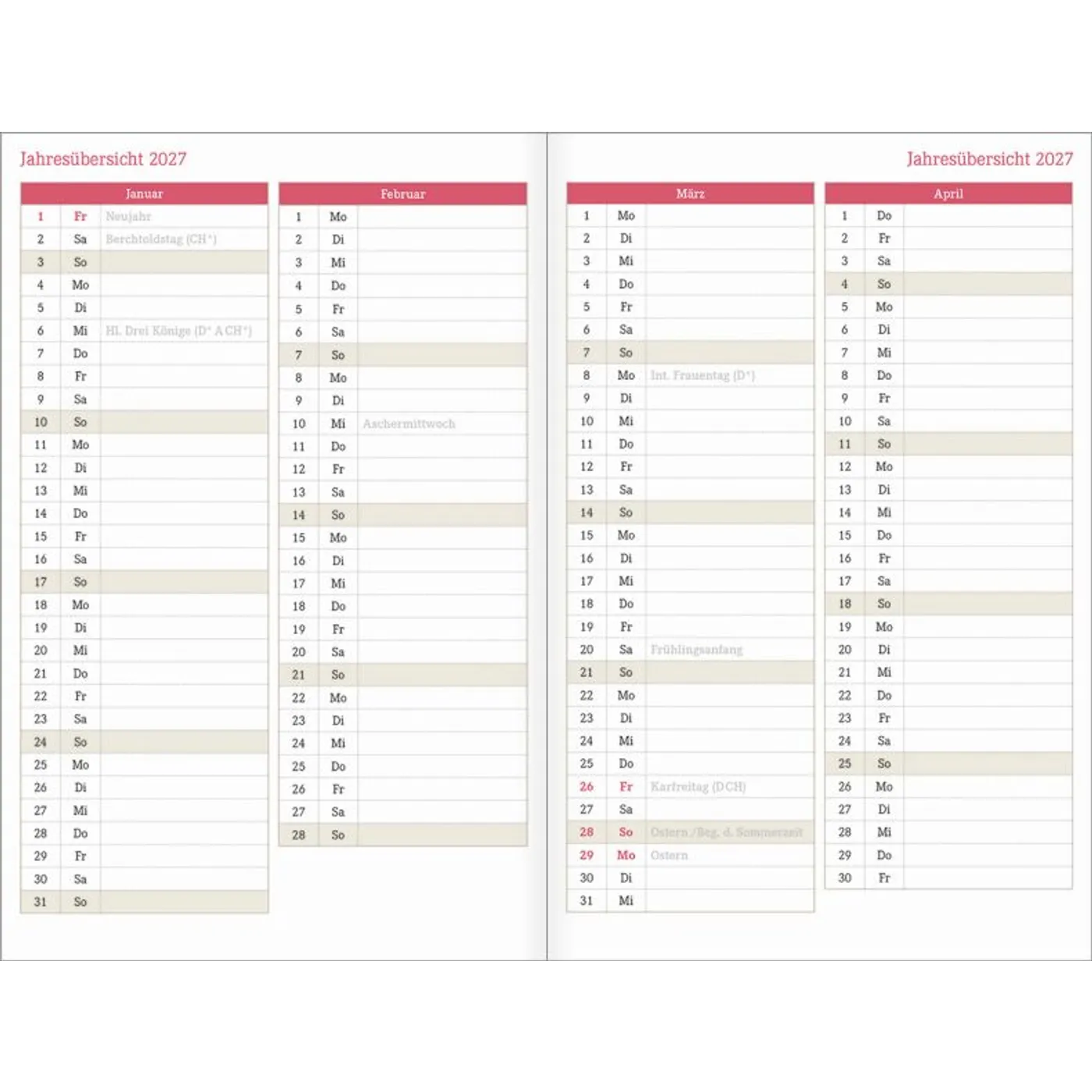 - je eine Doppelseite pro Woche