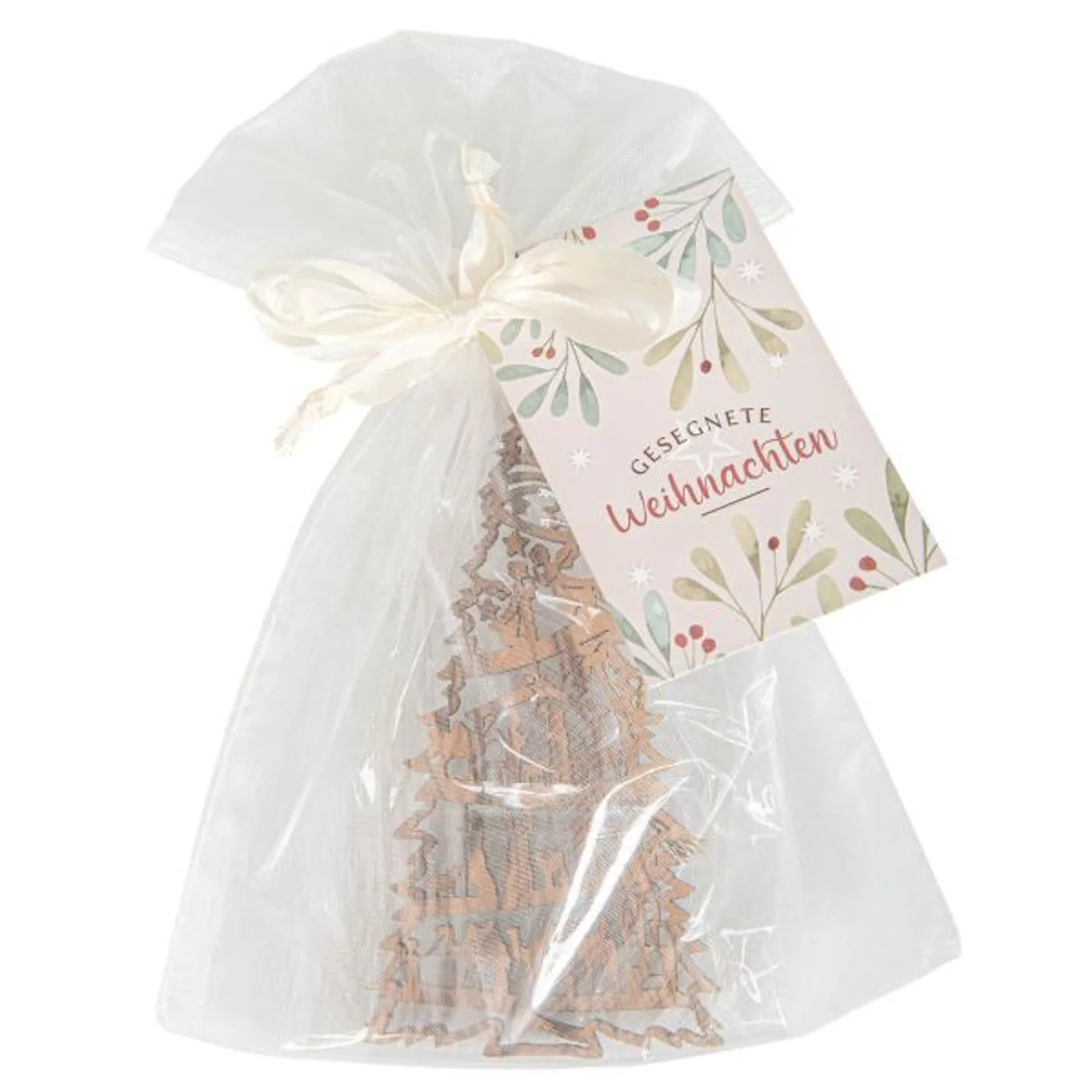 Außergewöhnlicher Baumschmuck: der Anhänger aus Olivenholz zeigt die Bibelgeschichte von der Geburt Jesu in aufwändigen gelaserten Details. Die Baumform des Anhängers schmückt jeden Weihnachtsbaum oder Tannenzweige während der Adventszeit.