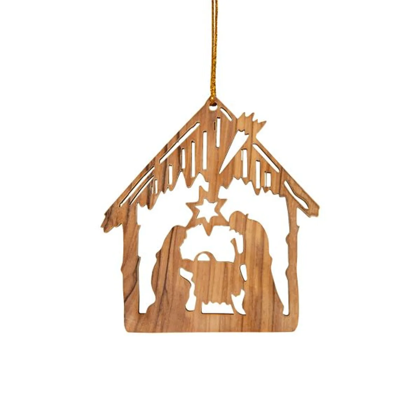 Außergewöhnlicher Baumschmuck: der Anhänger aus Olivenholz zeigt eine aufwändig gelaserte Krippe. Die Form des Anhängers schmückt jeden Weihnachtsbaum oder Tannenzweige während der Adventszeit.