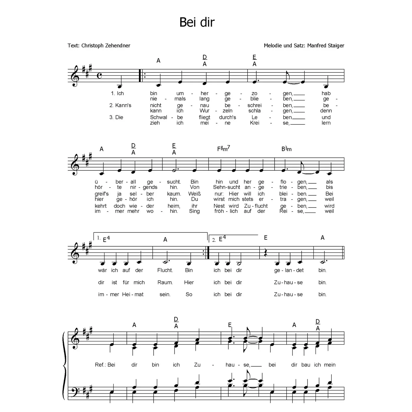 Bei dir (diese Variante haben Sie gerade ausgewählt) (Worship, einstimmig, vierstimmig) Manfred Staiger (Melodie, Chorsatz), Christoph Zehendner (Text) |