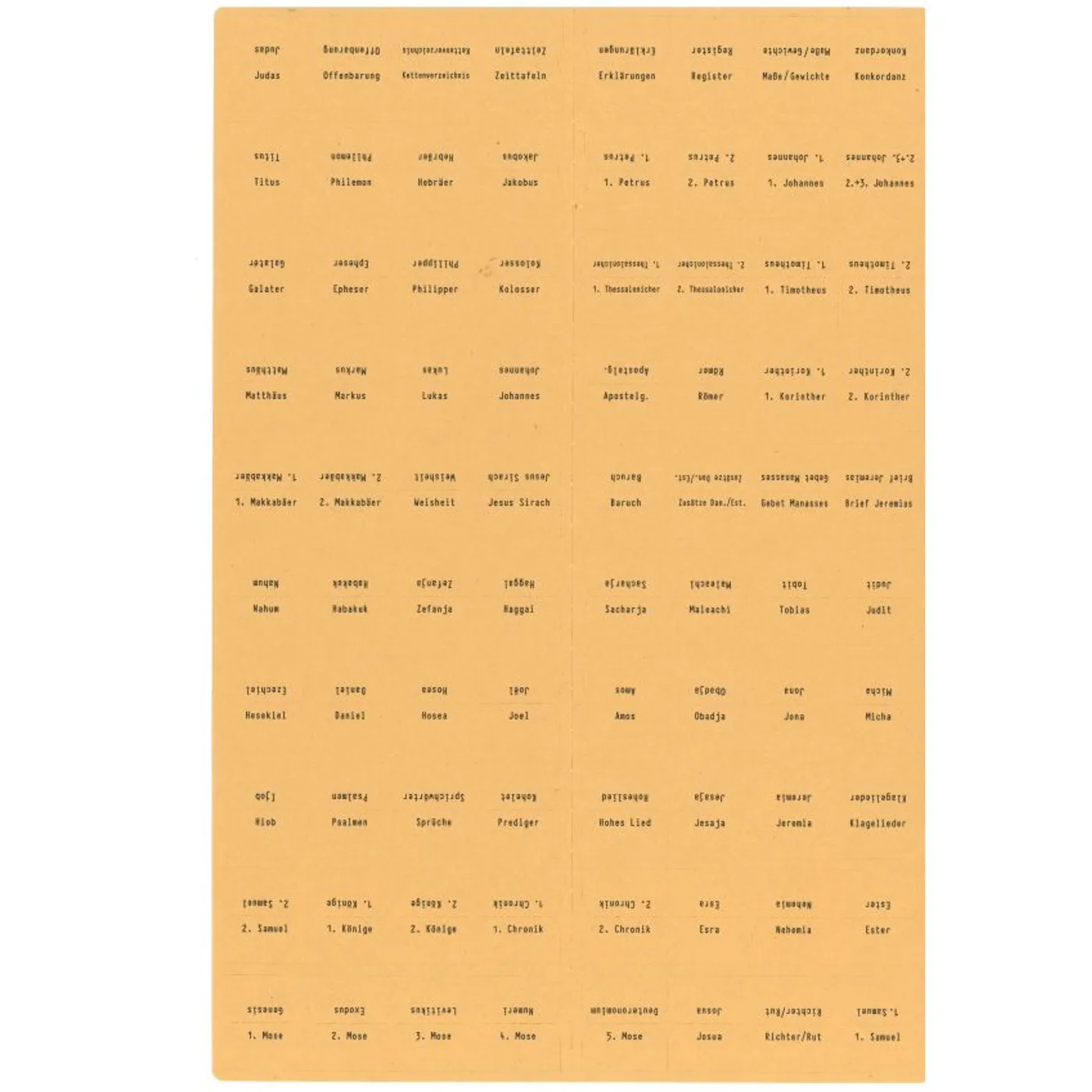Griffregister mit Klebeflächen, die man vorsichtig auch wieder vom Papier lösen und umkleben kann. Die Auswahl der Sonderbegriffe fand ich gut: Kettenregister, Zeittafeln, Konkordanz.. Schade finde ich, dass Richter und Rut auf einem Register sind und ich habe ein Register für Karten vermisst. Es sieht ein bisschen so aus als wollte man nicht mehr als einen Papierbogen dafür benutzen. Ansonsten sehr schön gemacht.