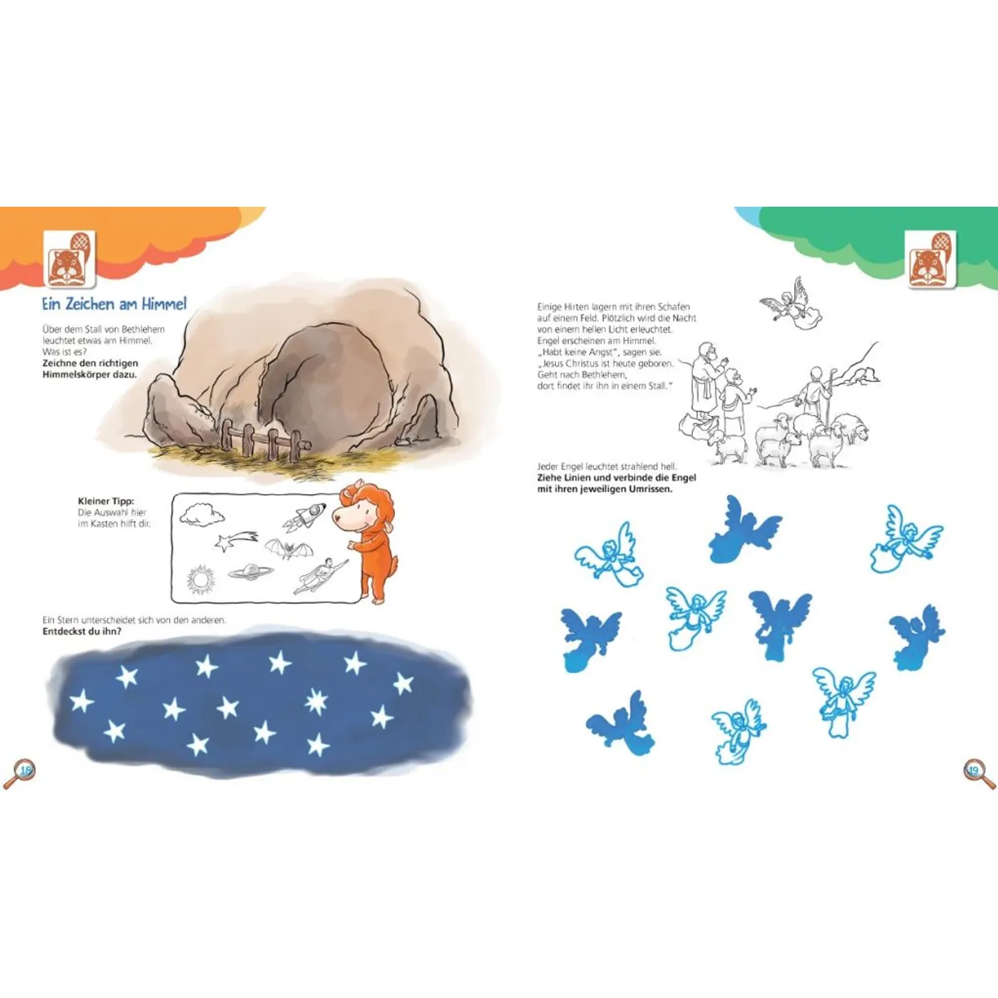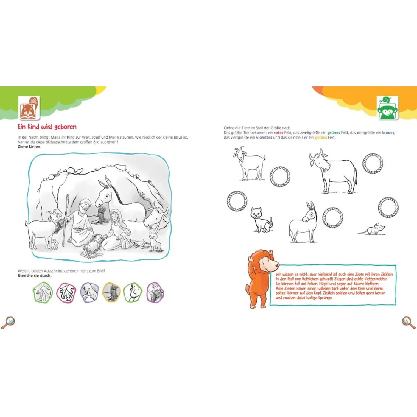 Durch Labyrinthe, Such- und Malbilder, Fehler finden, Zuordnungsaufgaben und vieles mehr entdecken sie die Geschichte von Jesu Geburt auf kreative und unterhaltsame Weise.