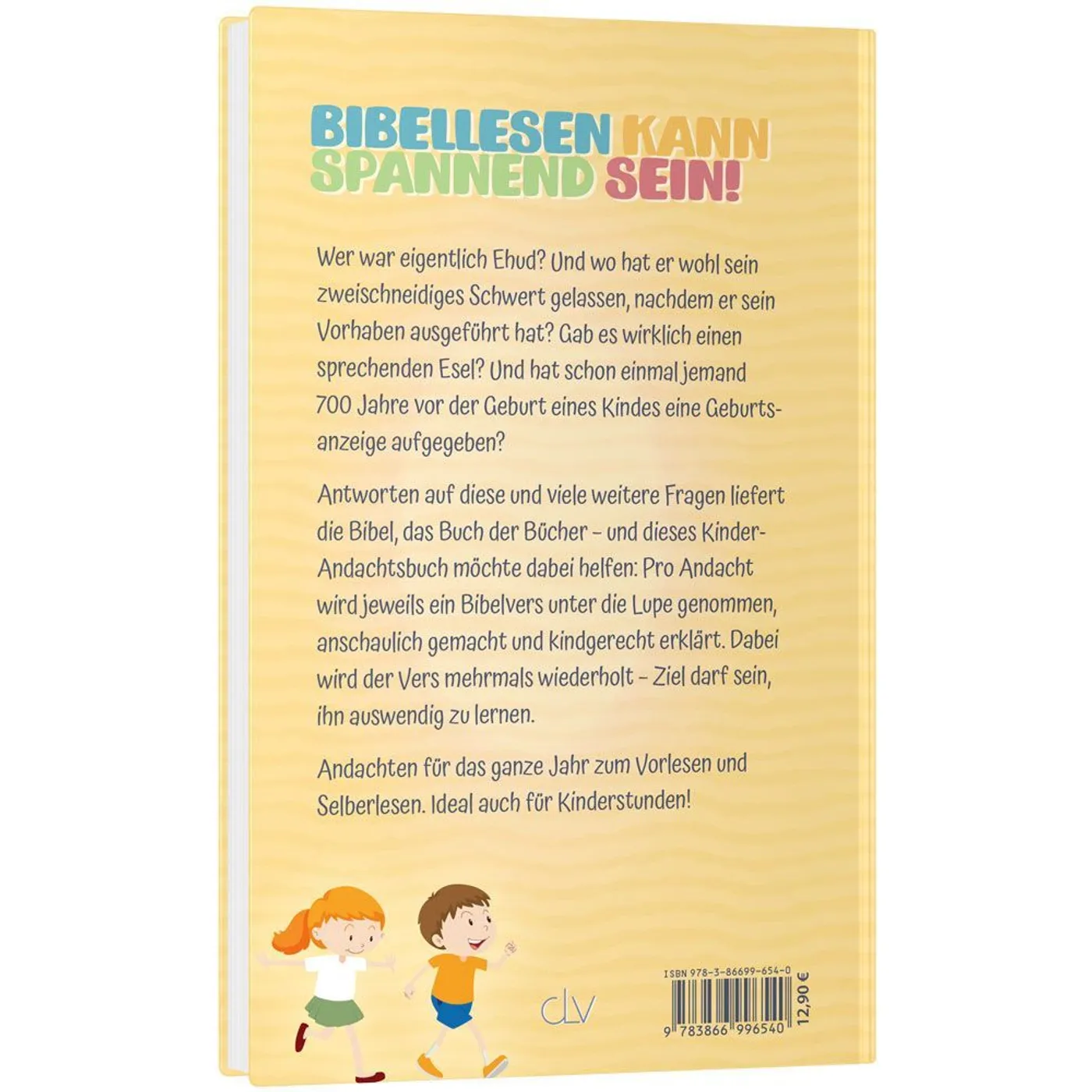 Antworten auf diese und viele weitere Fragen liefert die Bibel, das Buch der Bücher – und dieses Kinder-Andachtsbuch möchte dabei helfen: Pro Andacht wird jeweils ein Bibelvers unter die Lupe genommen, anschaulich gemacht und kindgerecht erklärt. Dabei wird der Vers mehrmals wiederholt – Ziel darf sein, ihn auswendig zu lernen.