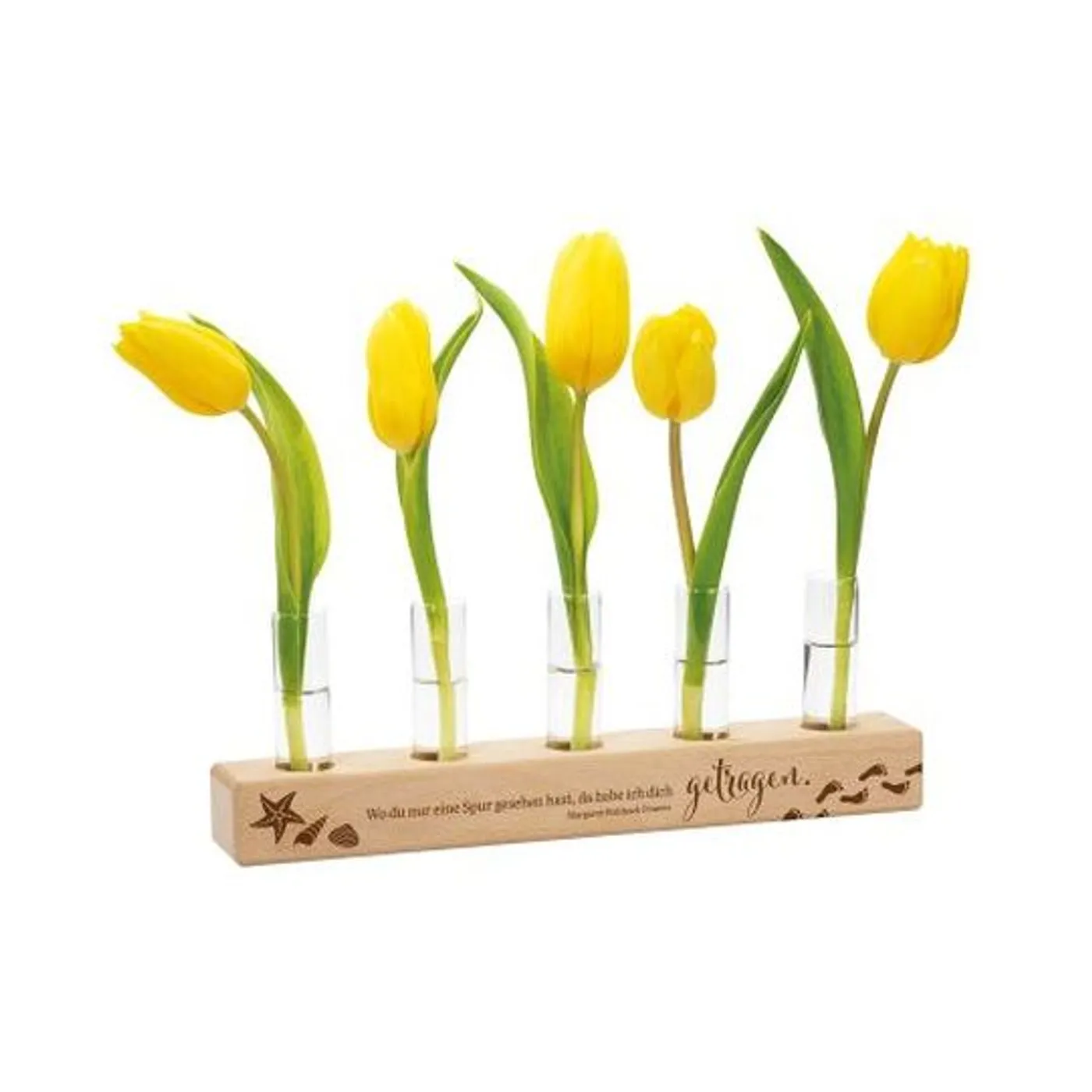 Ein Holzständer aus heimischer Buche mit einem kurzen Zitat aus dem bekannten Gedicht von Margaret Fishback Powers „Spuren im Sand” – hergestellt in Deutschland. Die kleinen Glasvasen bieten Platz für einzelne Blumen oder Zweige. Eine innovative Dekorationsidee und ein stilvolles Geschenk, das viel Freude bereiten wird.
