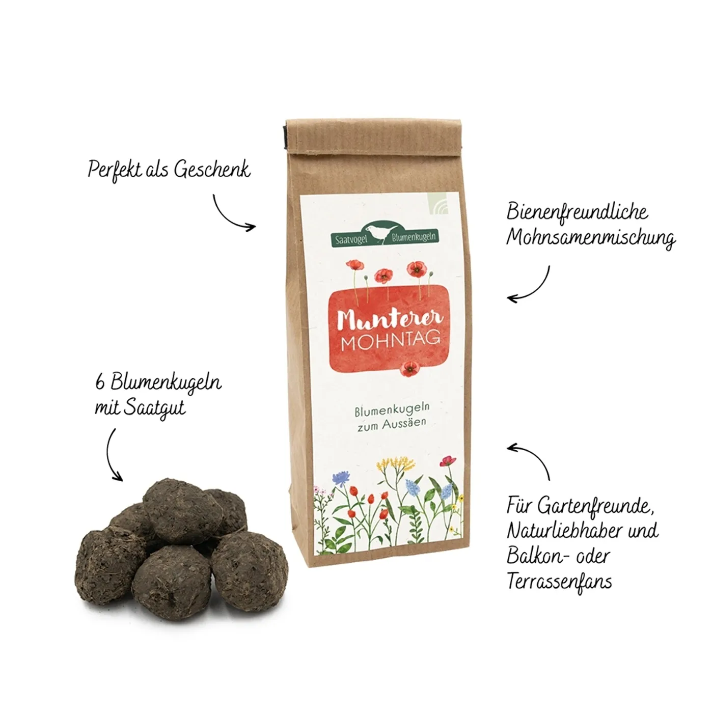 Unsere neuen Saatgutkreationen sind das perfekte Geschenk für alle Gartenfreunde, Naturliebhaber und Balkon- und Terrassenfans. Aus den 6 Blumenkugeln wachsen verschiedene Sorten Mohnblumen, u. a. Klatschmohn, Seidenmohn, Sandmohn und der kalifornische Goldmohn