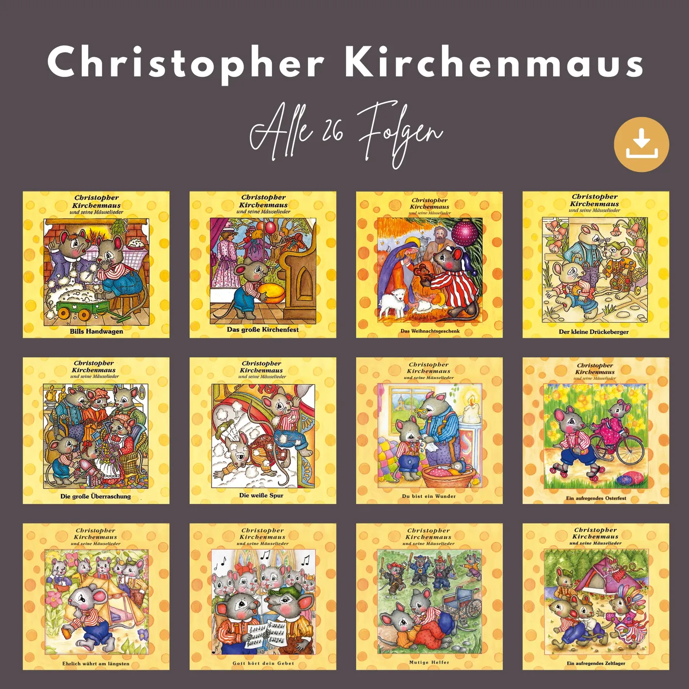 Christopher Kirchenmaus ist ein Klassiker der christlichen Hörspiel-Unterhaltung. Kinder mehrerer Generationen lieben bis heute die drollige Kirchenmaus und ihre Freunde. Christopher Kirchenmaus erzählt Abenteuer aus seinem Mäuse-Leben und Geschichten aus der Bibel. Dazu gibt es flotte Musik von Helmut Jost. Alle 26 musikalischen Mäuse-Abenteuer gibt es jetzt in diesem Download-Paket zu entdecken. Und das absolut „mäuse-günstig“.
