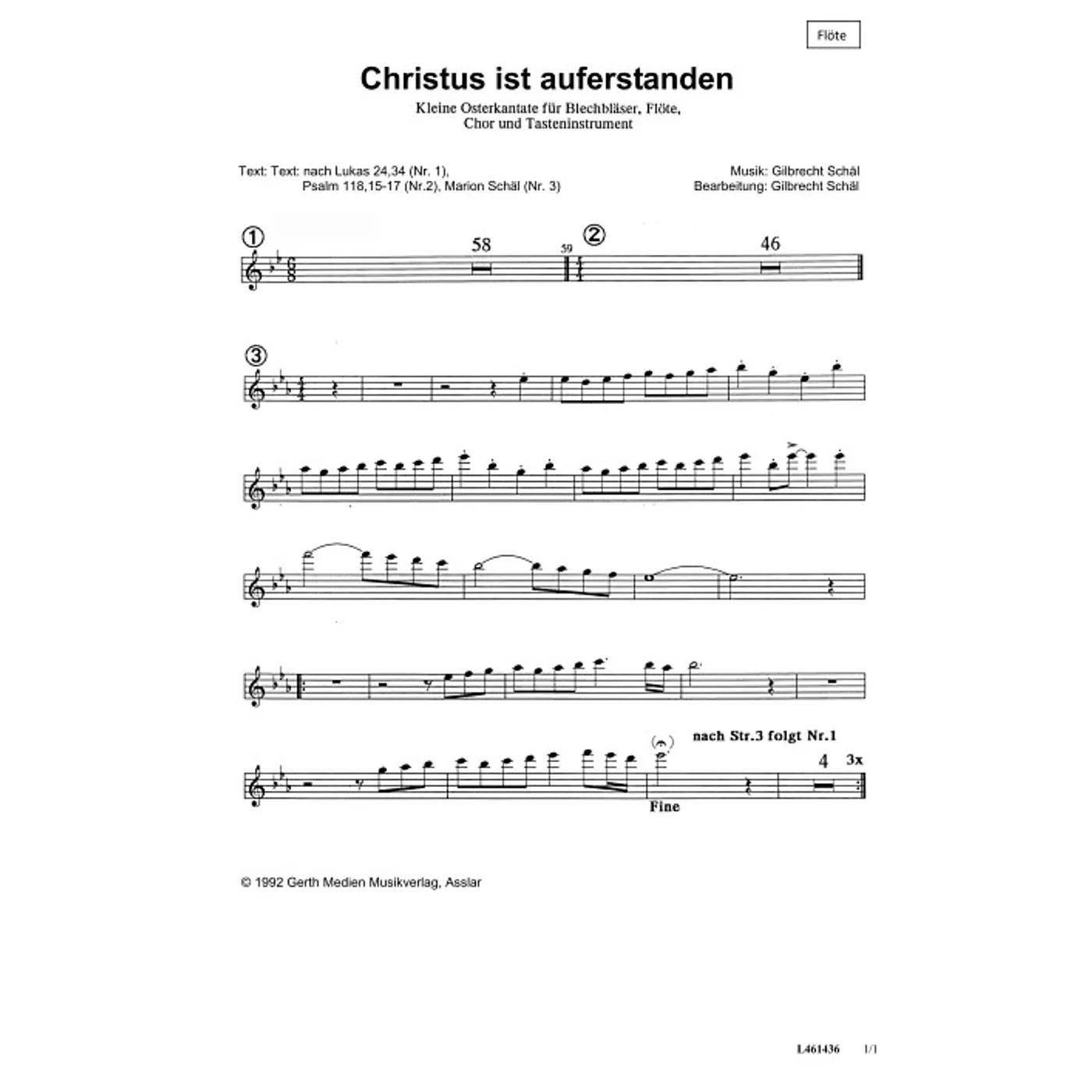 Christus ist auferstanden (Flöte) (diese Variante haben Sie gerade ausgewählt) (Kantate, traditionell, Orchestereinzelstimme) Gilbrecht Schäl (Komposition), Marion Schäl (Text) |
