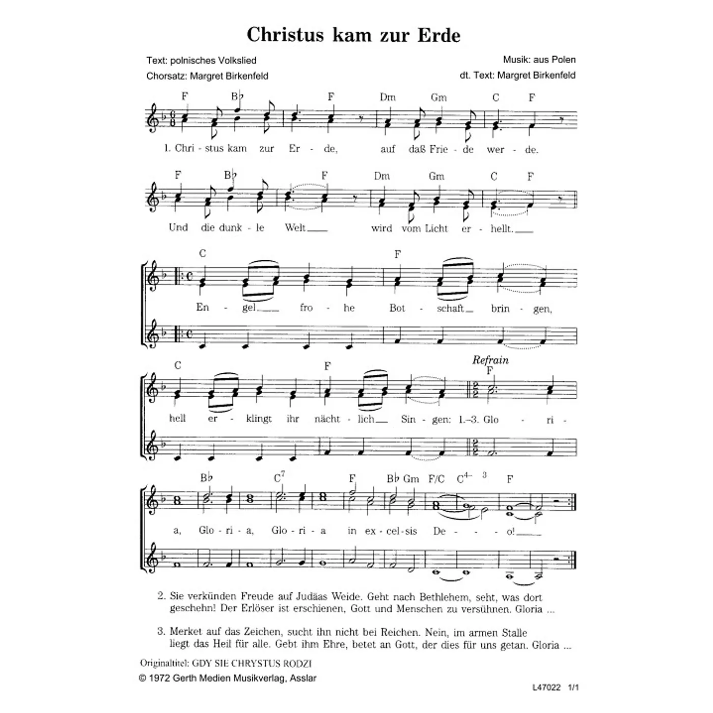 Christus kam zur Erde (diese Variante haben Sie gerade ausgewählt) (Kinderchor, dreistimmig, mit Akkorden, F-Dur) Margret Birkenfeld (Chorsatz, Übersetzung) |