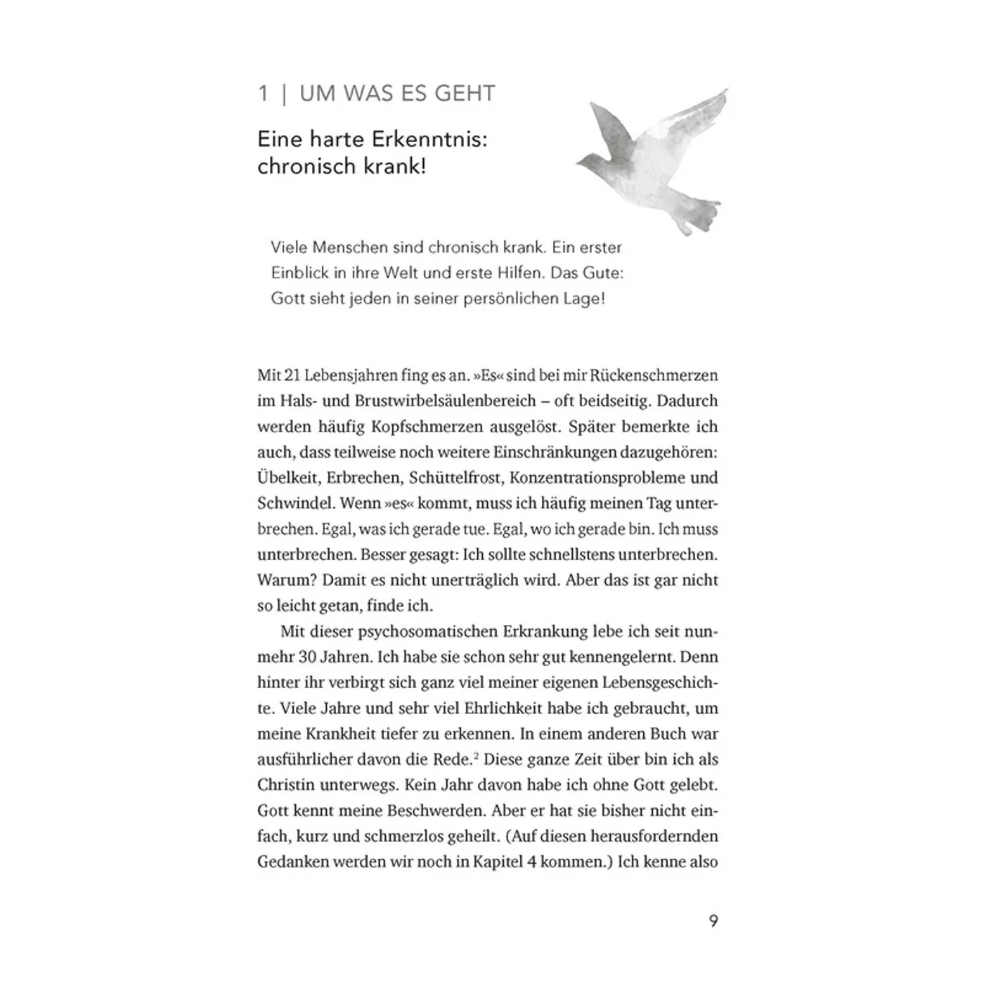 Erfrischend ehrlich, basierend auf 30 Jahren durchlebter Krankheitsphasen, beschreibt die ehemalige Lehrerin für Deutsch und Musik und heutige Referentin, Jahrgang 1965, wie sie als Christin gelernt hat, versöhnt zu leben. Sie möchte den Lesern durch immer wieder eingestreute Fragen zum Weiterdenken Mut zur Bewältigung des eigenen Erlebens von chronischer Krankheit geben. Starke Höhepunkte am Ende jedes Kapitels sind kurze Interviews mit bekannten und unbekannten Christen. In diesen Gesprächen geht es zur Sache: von einer Nahtod-Erfahrung bis hin zur Multimorbidität kann man staunend erfahren, wie vielfältig Gottes Eingreifen aussieht.