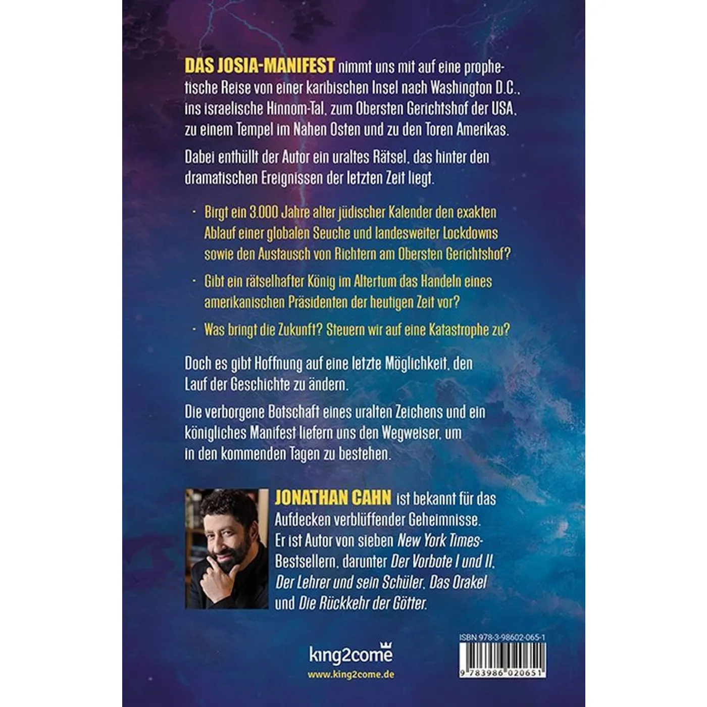DAS JOSIA-MANIFEST nimmt uns mit auf eine prophetische Reise von einer karibischen Insel nach Washington D.C., ins israelische Hinnom-Tal, zum Obersten Gerichtshof der USA, zu einem Tempel im Nahen Osten und zu den Toren Amerikas. Dabei enthüllt der Autor ein uraltes Rätsel, das hinter den dramatischen Ereignissen der letzten Zeit liegt.