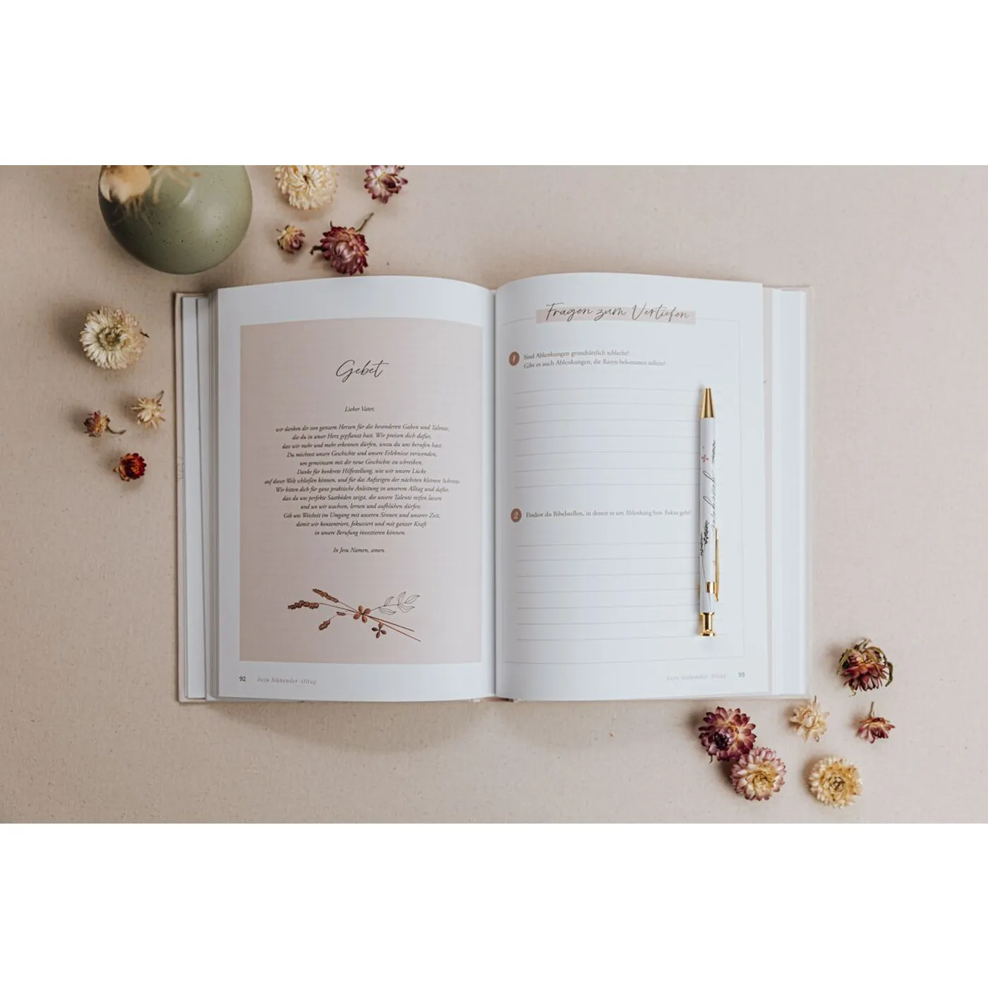 Das Buch hat insgesamt 12 Kapitel. Beginnend mit Gedanken der Autorin zu dem jeweiligen Thema, dann ein Gebet, anschließend vertiefende Fragen mit ausreichend Platz für eigene Notizen und endet mit einem Kreativteil.