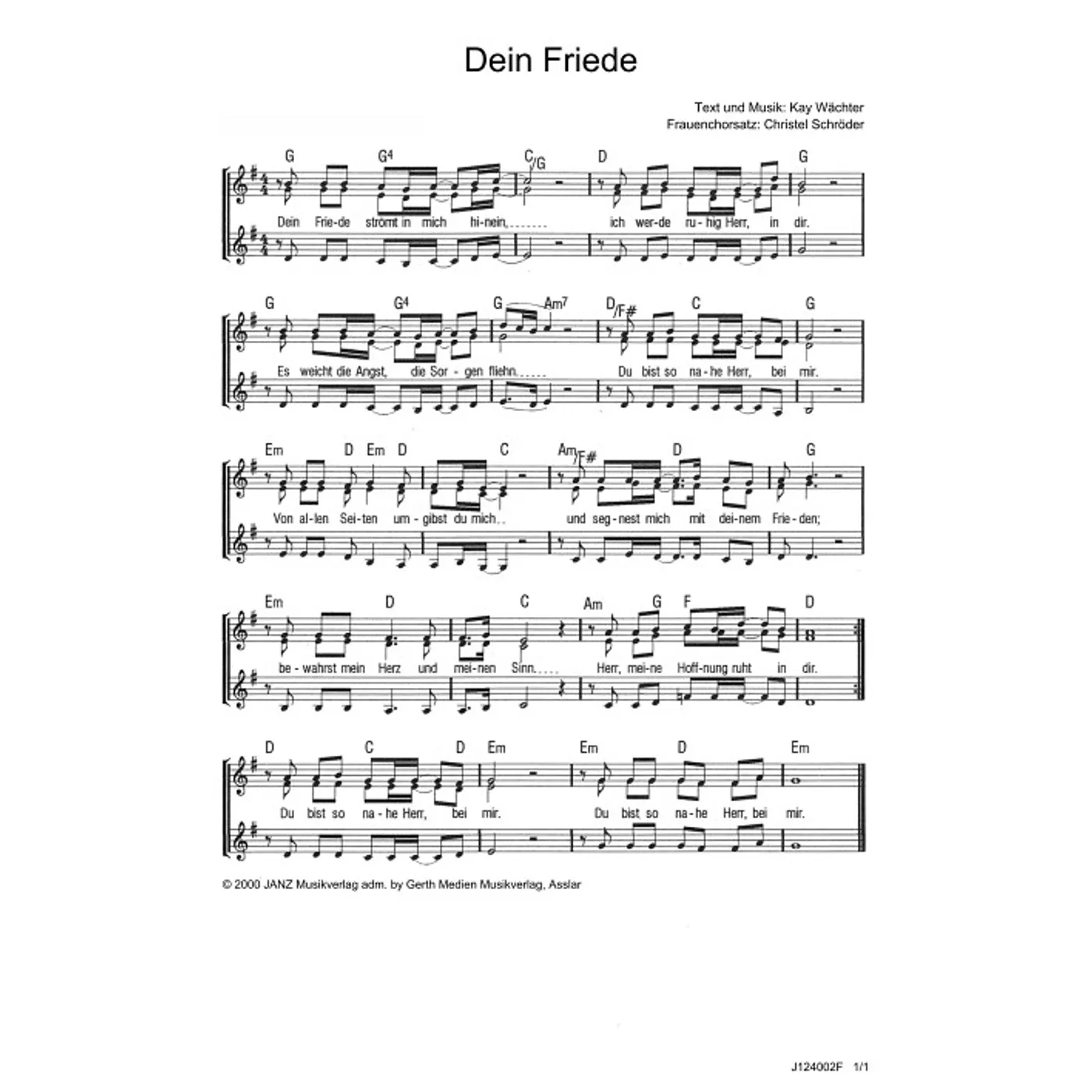 Dein Friede (modern, gemischter Chor, mit Akkorden, vierstimmig, G-Dur) Kay Wächter (Komposition, Text) | modern, gemischter Chor, mit Akkorden, vierstimmig, G-Dur | 1,50 € |