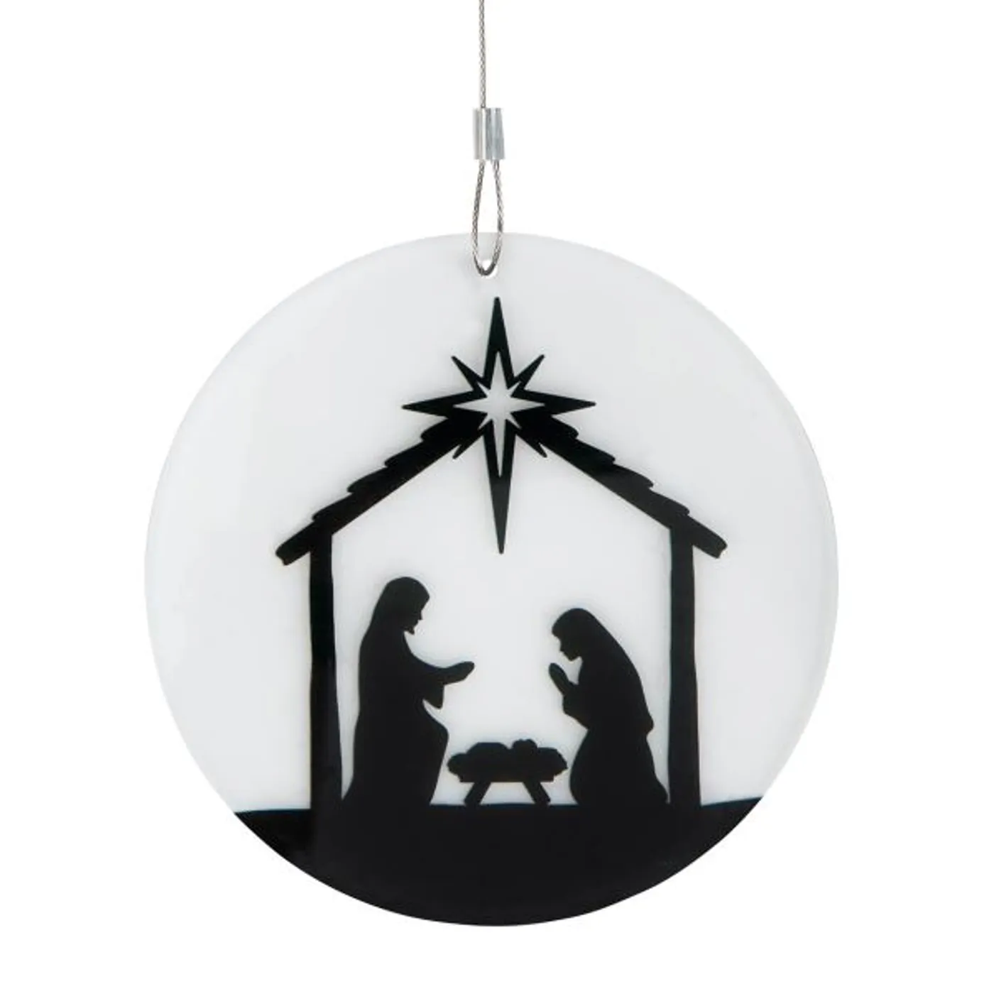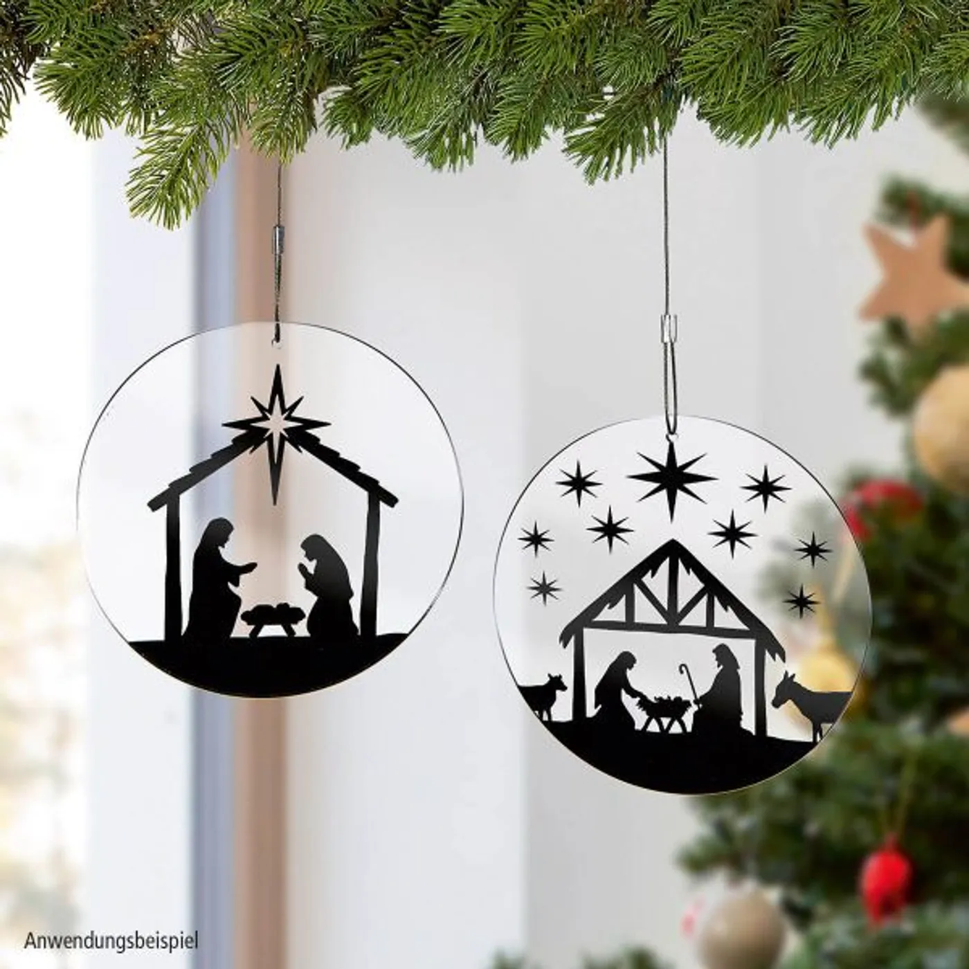 Eine sehr moderne Idee, um z.B. Fenster weihnachtlich zu dekorieren: Dekohänger aus transparentem Acryl, die mit einer Krippe schwarz in Scherenschnitt-Optik bedruckt ist.
