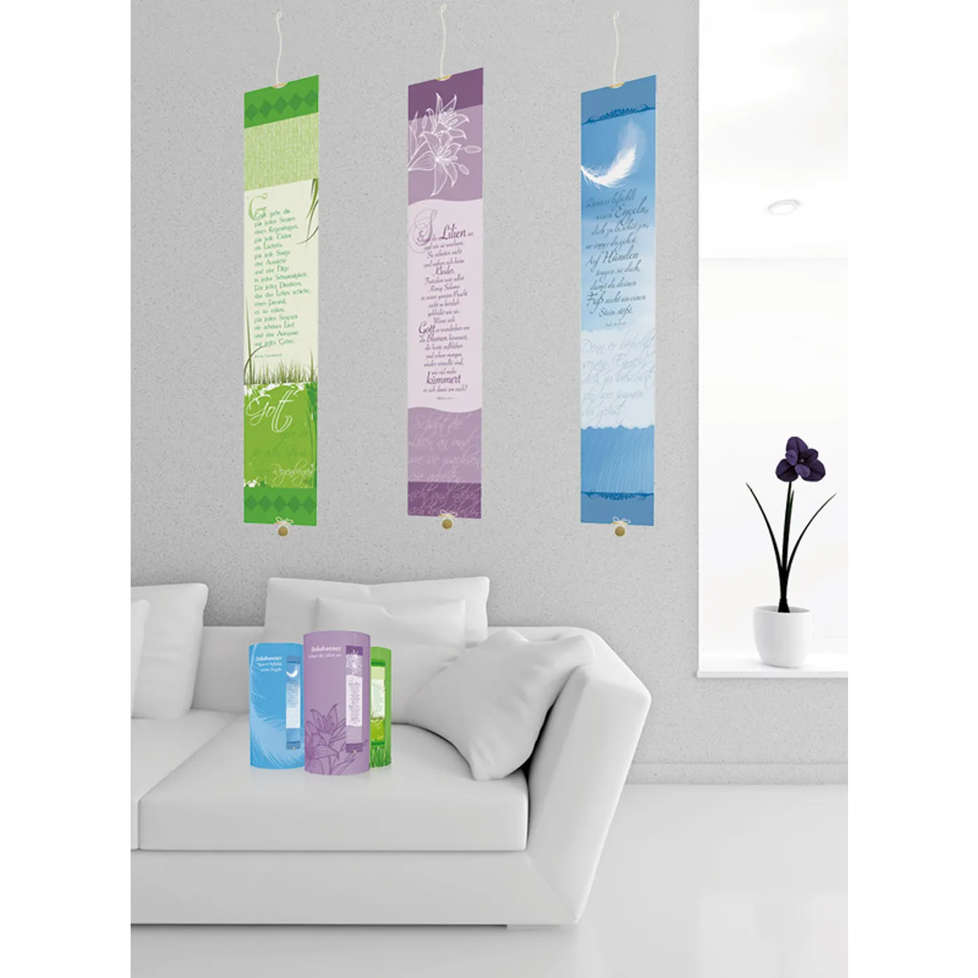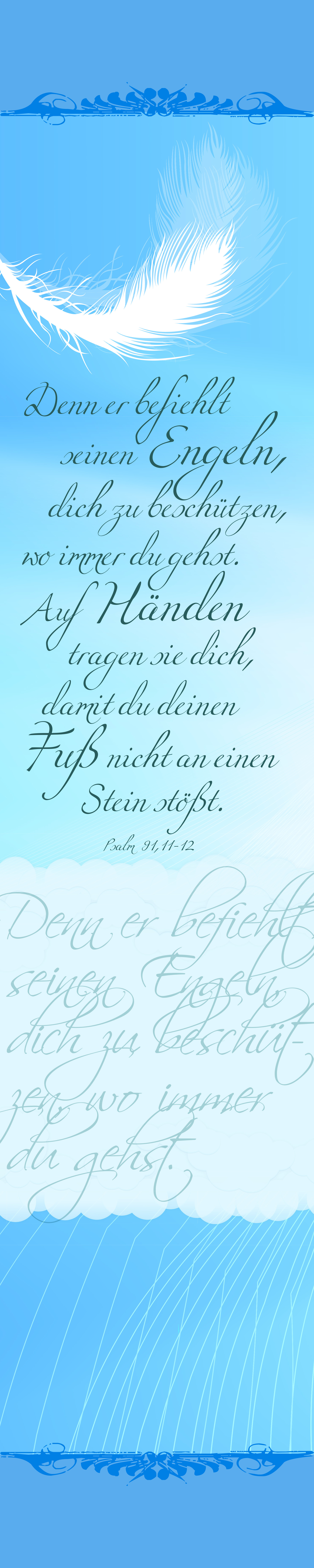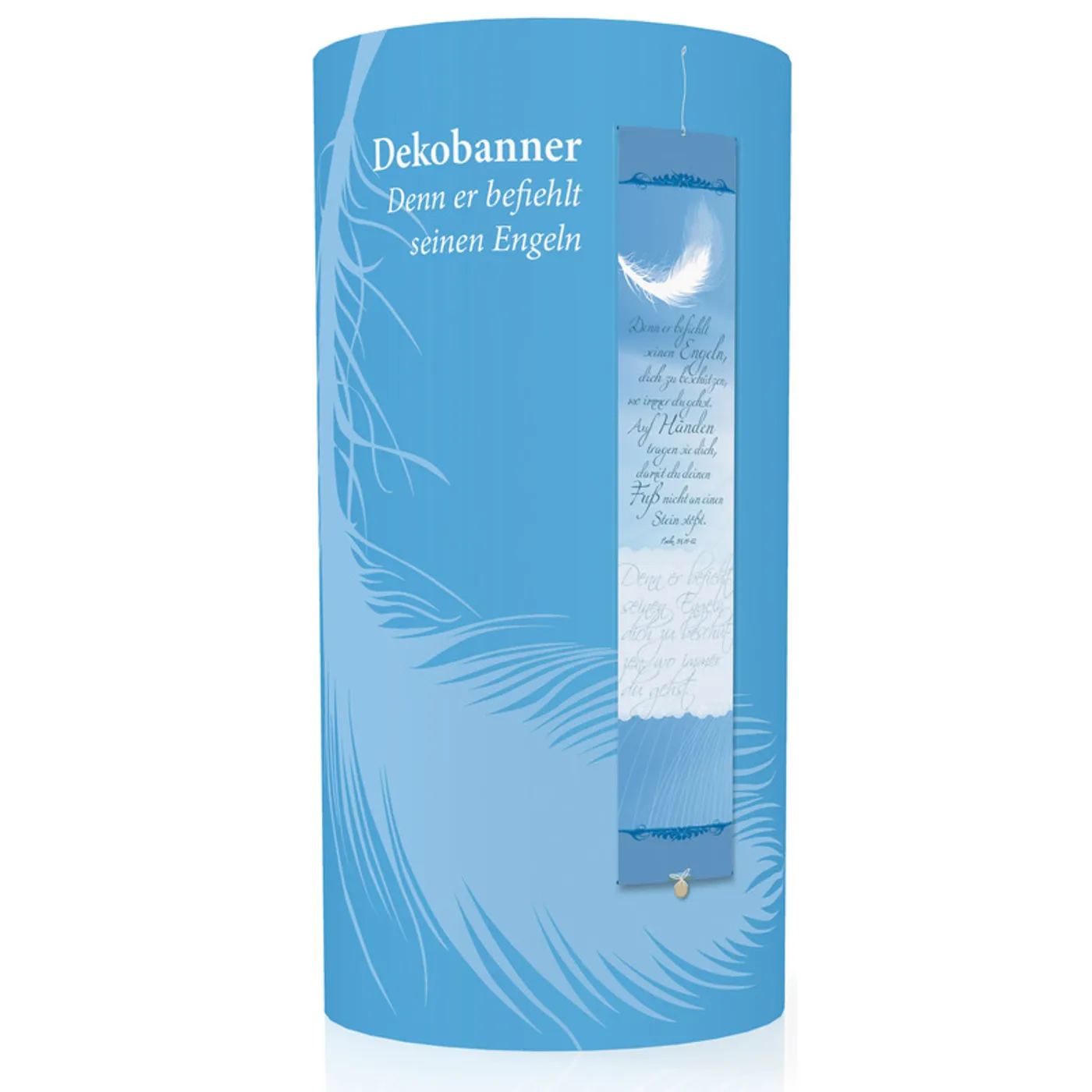 "Denn er befiehlt seinen Engeln, dich zu beschützen, wo immer du gehst. Auf Händen tragen sie dich, damit du deinen Fuß nicht an einen Stein stößt." Der Psalmtext (Psalm 91,11-12) ist eine stetige Ermutigung und gleichzeitig ein attraktiver Blickfang. Das Dekobanner hat eine Größe von 15 x 75 cm. Das strukturierte Spezialpapier wurde an beiden Enden auf Holzstäbe gezogen. An der Oberkante befindet sich eine Nylonschlaufe, die dafür sorgt, dass es sich unkompliziert aufhängen lässt. Eine Holzkugel am unteren Ende dient als Gegengewicht. Das Dekobanner wird gerollt in einer stabilen Klarsichthülle geliefert.
