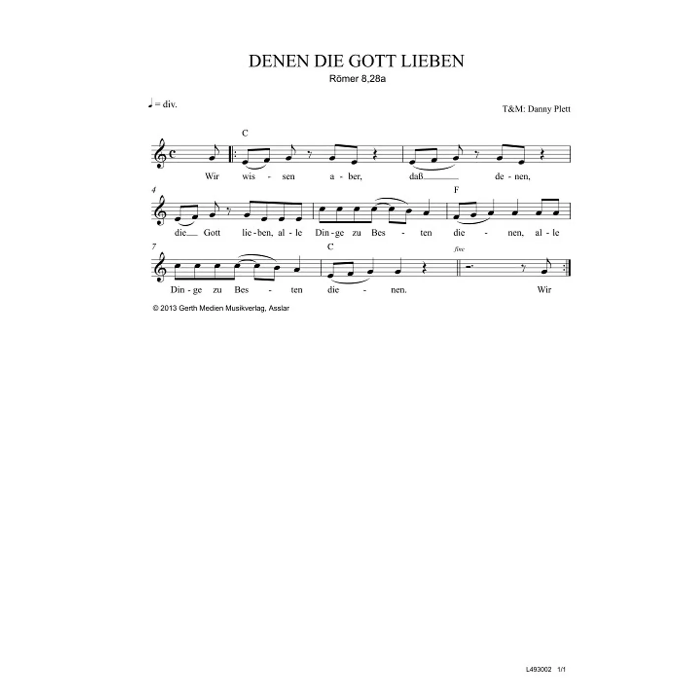Denen, die Gott lieben (diese Variante haben Sie gerade ausgewählt) (einstimmig, mit Akkorden, C-Dur) Danny Plett (Komposition) |