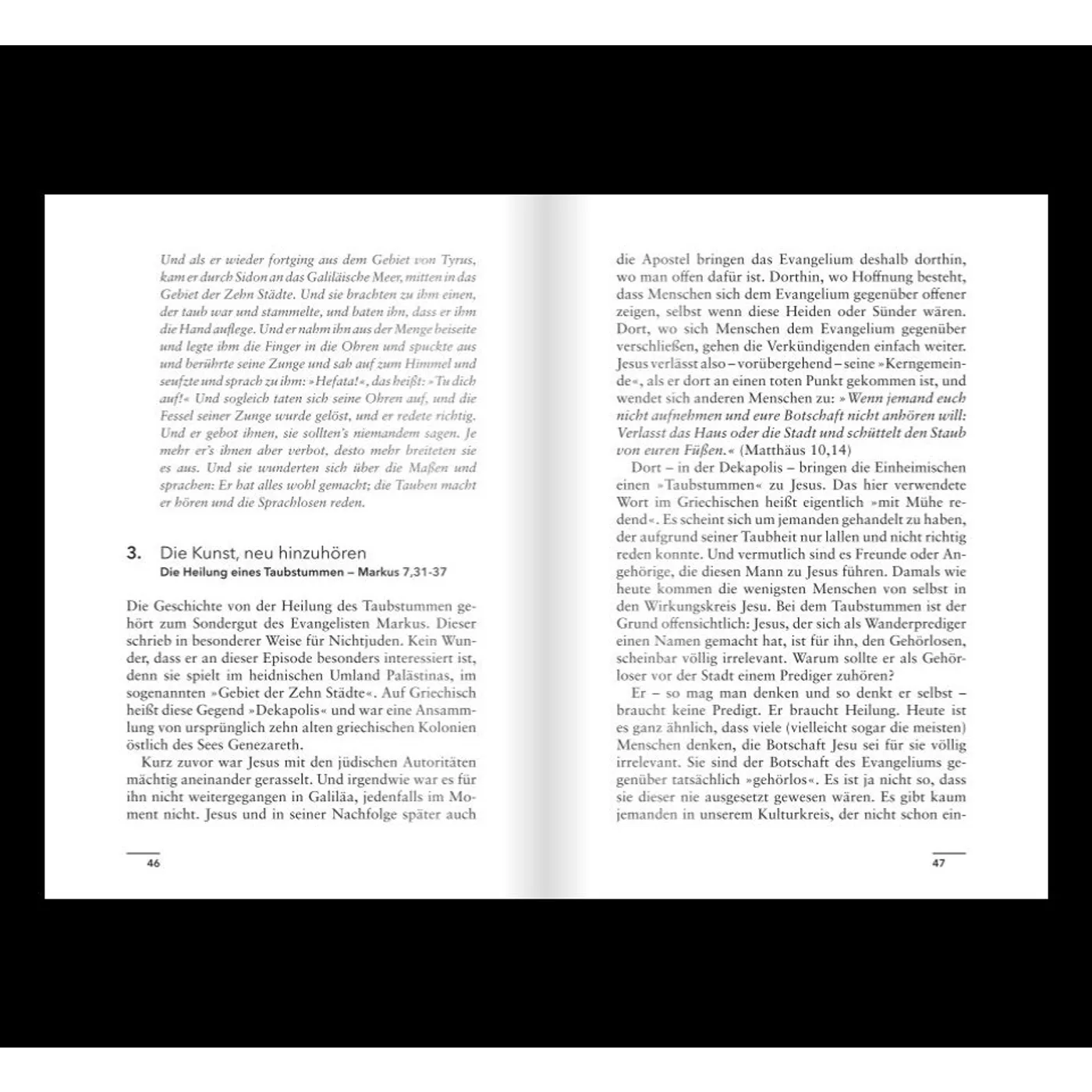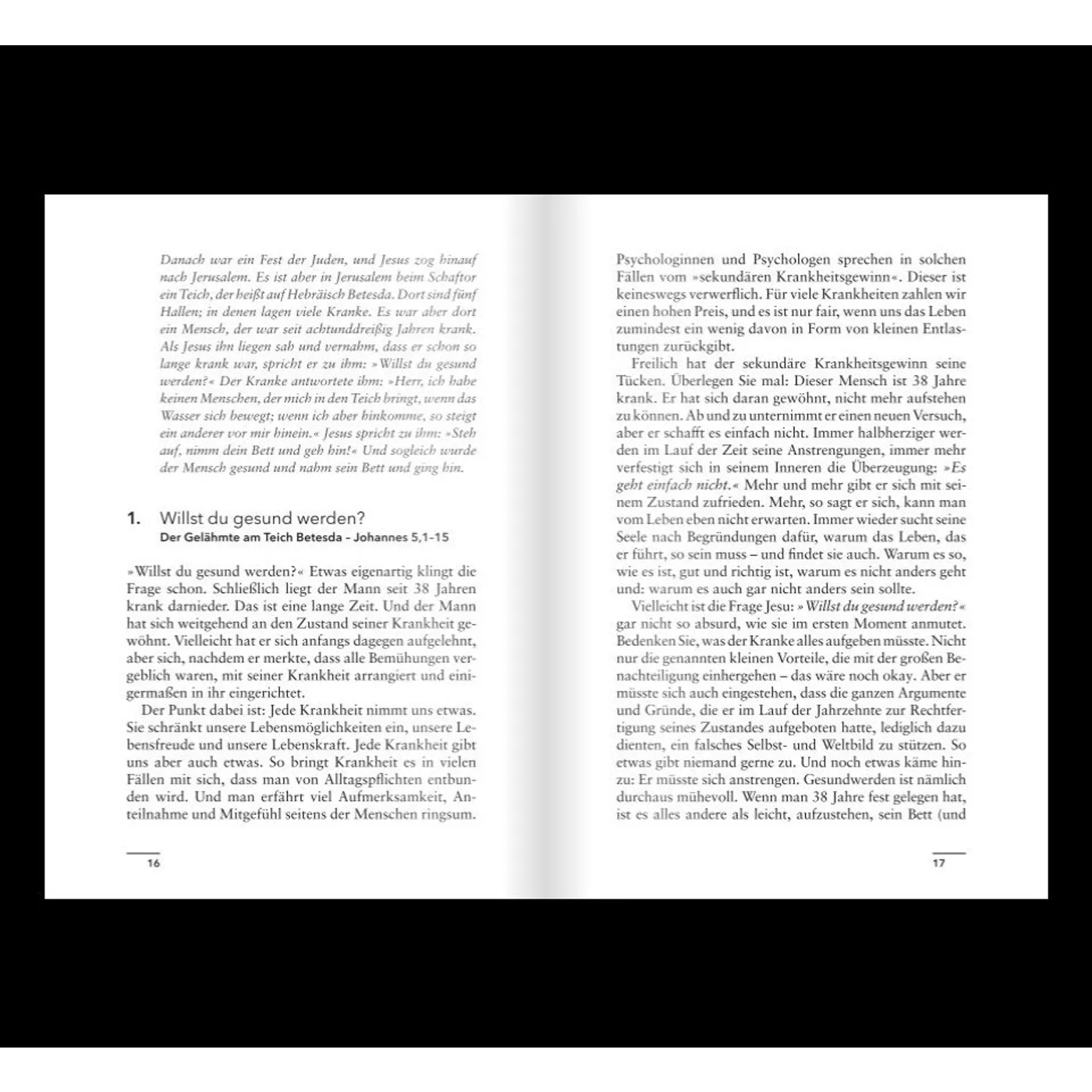 Ein übersichtliches Inhaltsverzeichnis noch vor der ersten Geschichte gibt einen Überblick über die Heilungsgeschichten mit Angabe der jeweiligen Bibelstelle, deren Texte zu Beginn eines jeden Abschnitts abgedruckt sind.