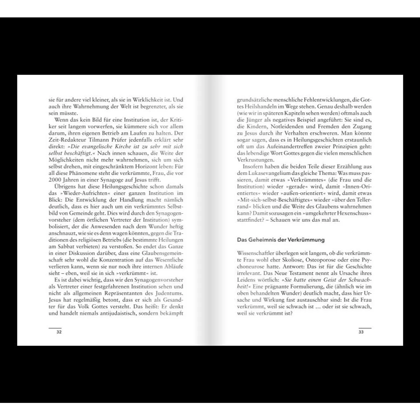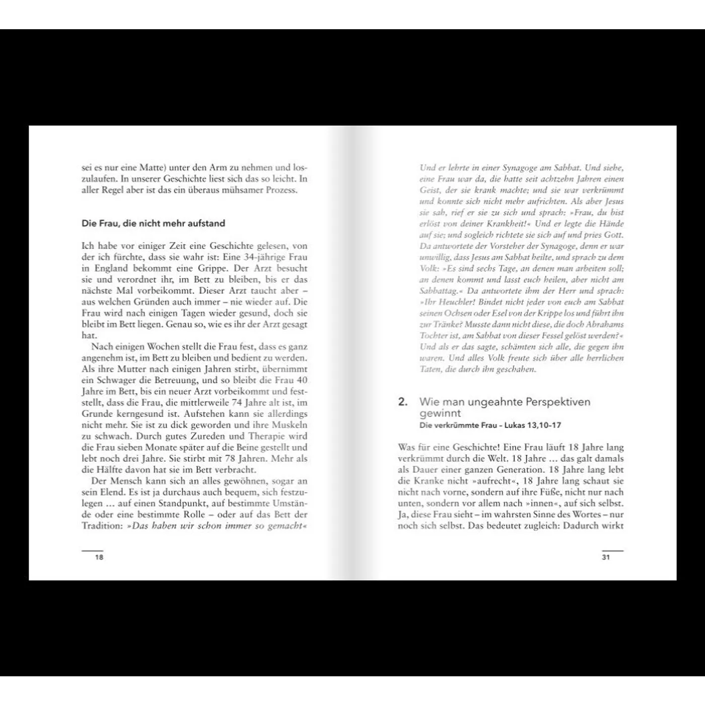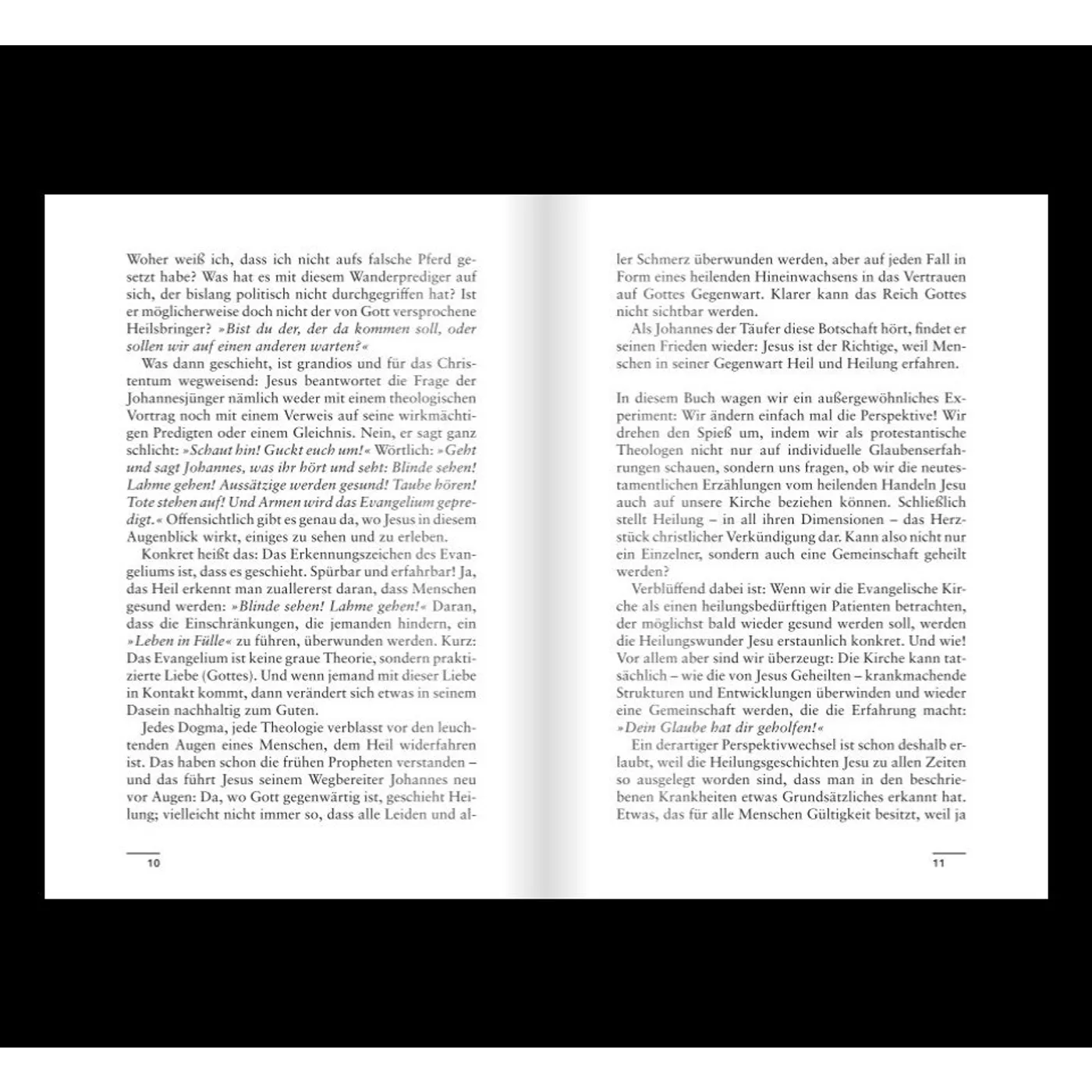 Anhand von 12 Heilungsgeschichten aus der Bibel wird neben der Auslegung der Bibelstellen, deren Kern-Aussagen auf die momentan kirchliche Situation transformiert. Bei dieser Anamnese werden die Probleme offen angesprochen, aber keine Patentantworten serviert.