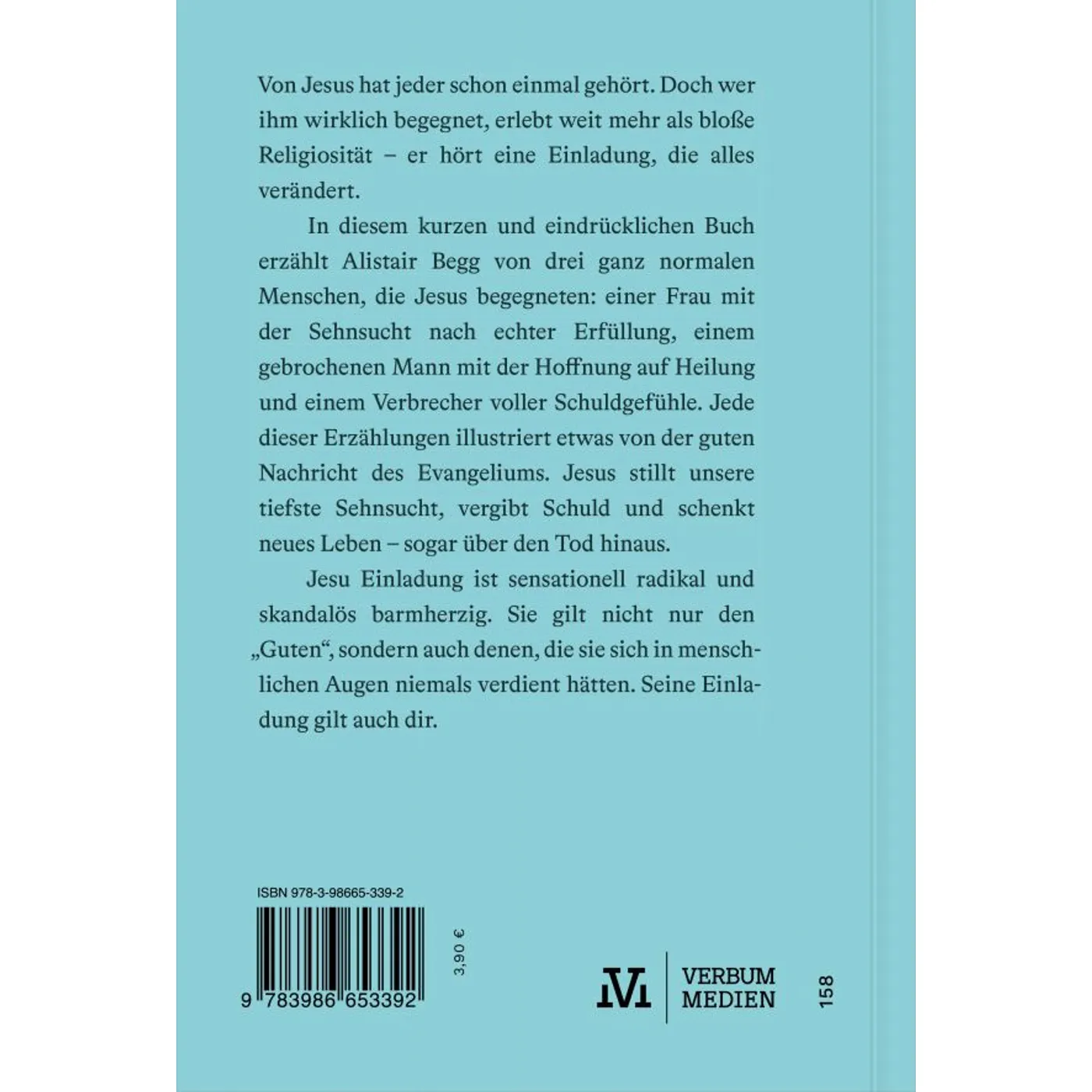 In diesem kurzen und eindrücklichen Buch erzählt Alistair Begg von drei ganz normalen Menschen, die Jesus begegneten: einer Frau mit der Sehnsucht nach echter Erfüllung, einem gebrochenen Mann mit der Hoffnung auf Heilung und einem Verbrecher voller Schuldgefühle. Jede dieser Erzählungen illustriert etwas von der guten Nachricht des Evangeliums.
