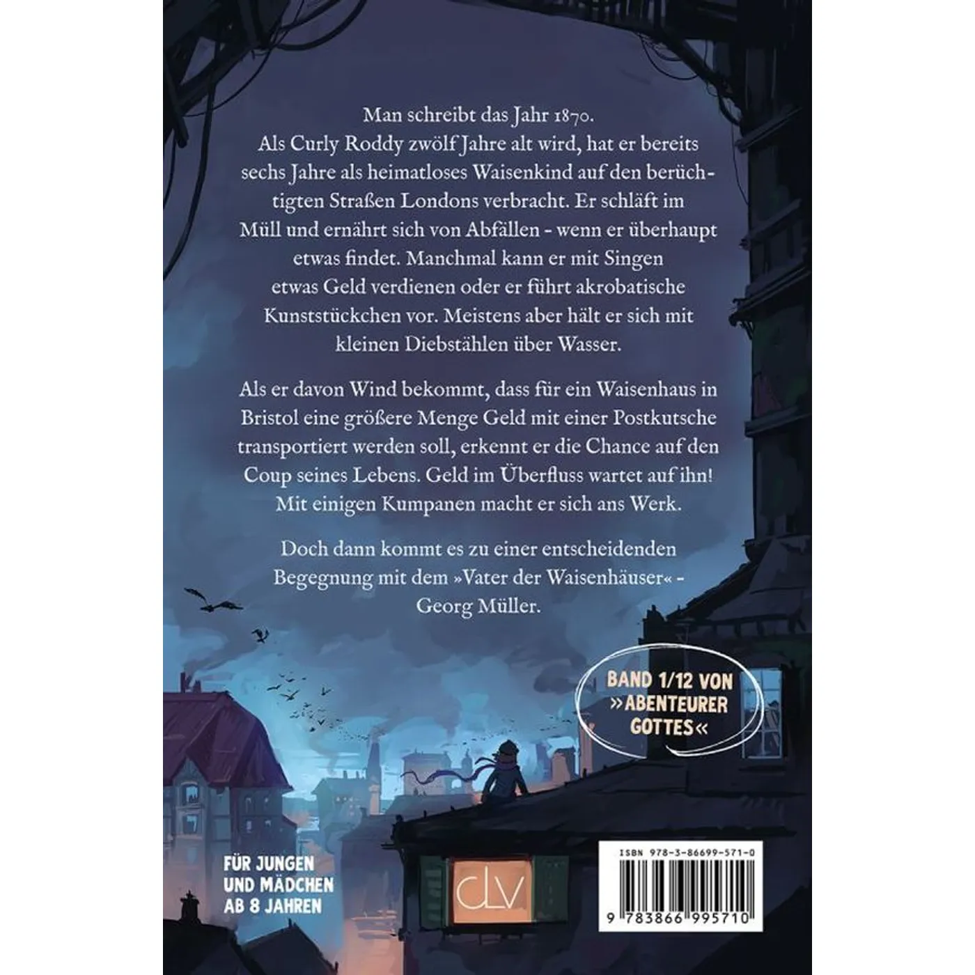 Das Buch beginnt hart: Curly Roddy, ein Waisenjunge, überlebt auf den Straßen Londons und gerät in ein kriminelles Netz. Der Einstieg ist rasant; die Flucht aus dem Glockenturm (ab Seite 7) ist stark inszeniert und zeigt, wie bildhaft und temporeich die Reihe arbeitet. Die Autoren verweben seine Notlage mit der historischen Person Georg Müller, dessen Dienst im Vorwort (Seite 5) knapp und treffend erklärt wird. Der Aufbau folgt Curlys Weg vom Diebstahl über den Raub bis zur überraschenden Wendung, die ihn nach Ashley Downs führt. Stilistisch ist das Buch klar, lebendig, nah an der Zielgruppe und vermittelt christliche Wahrheiten durch Handlung statt Moralpredigt. Das stärkt Verständnis für Gottes Fürsorge und das Wesen echter Barmherzigkeit.