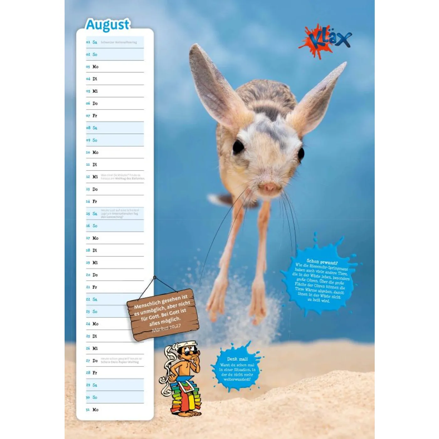 Im beliebten KLÄX-Kalender gibt es jeden Monat tolle Tierfotos, witzige Sprüche und Tipps zum Nach- und Weiterdenken über die Bibel, Gott und die Welt. Mister Kläx, die lustige Titelfigur der Kinderzeitschrift KLÄX, begleitet Kids ab 8 Jahren durch das Jahr.
