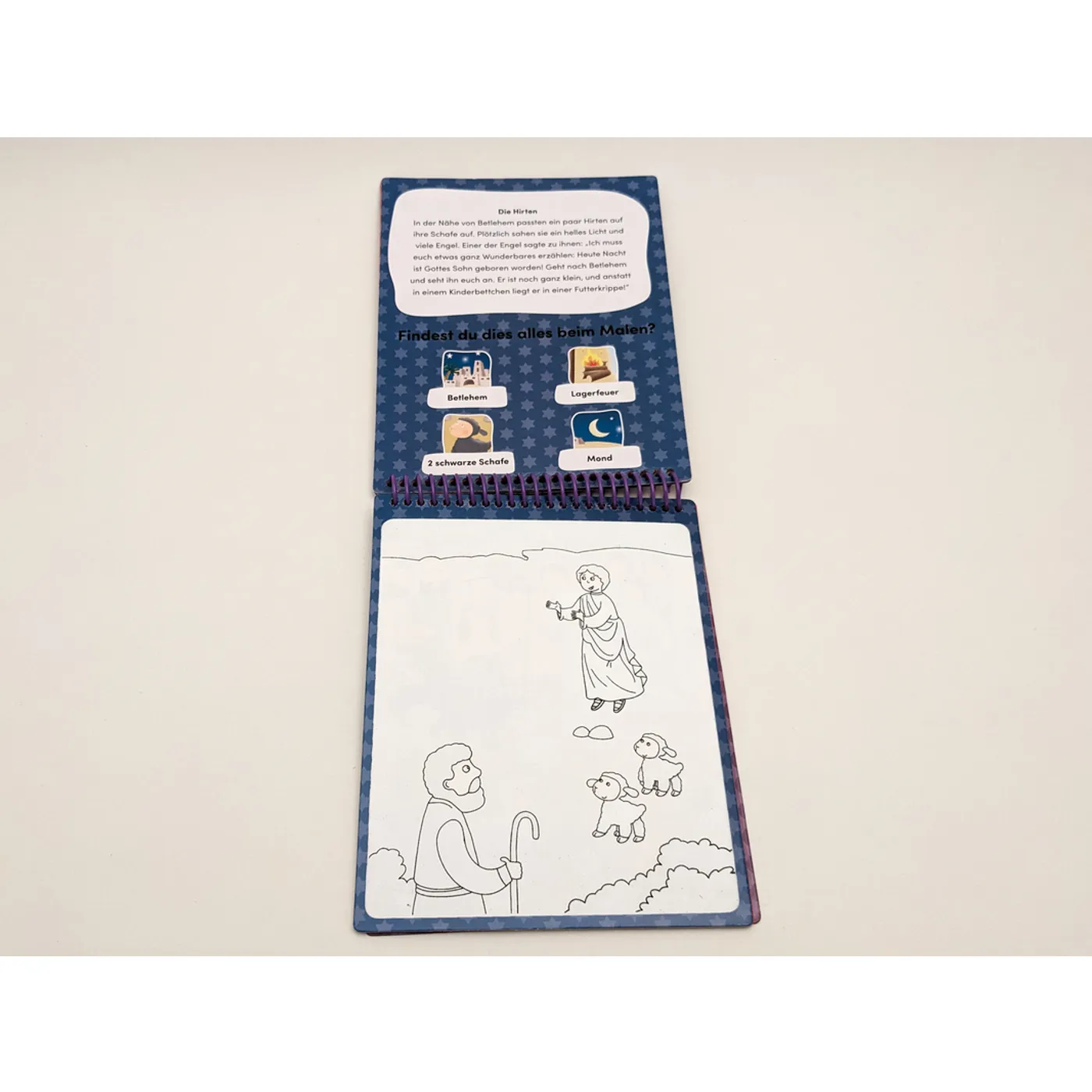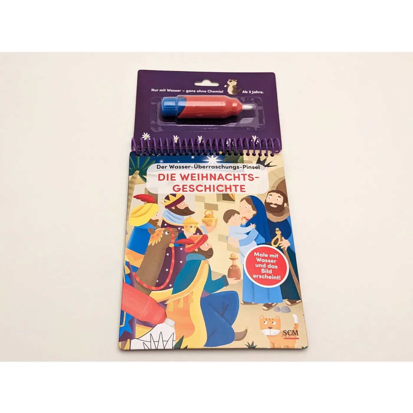 Mit diesem außergewöhnlichen Malbuch können Kinder auf spielerische Weise herausfinden, wie Jesus auf die Welt gekommen ist: Wenn man mit dem beiliegenden Pinsel über die weißen Flächen fährt, werden die farbigen Illustrationen sichtbar. Schon die Kleinsten werden staunen, wie viel sich beim Malen entdecken lässt! Sobald die bemalten Seiten trocknen, verschwindet die Farbe wieder, und man kann von vorne beginnen! Der beiliegende Wasser-Überraschungs-Pinsel lässt sich immer wieder neu mit Wasser auffüllen.