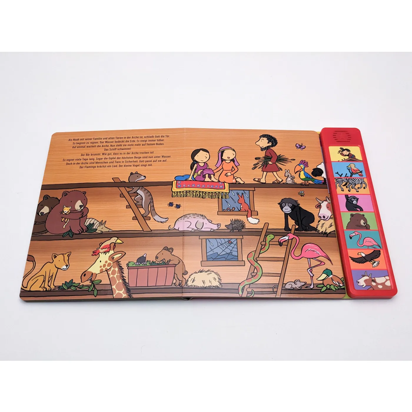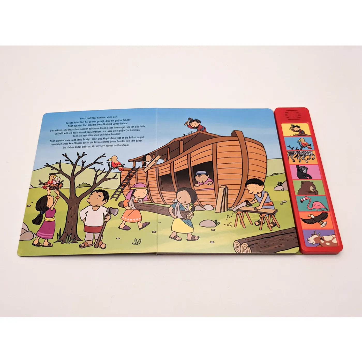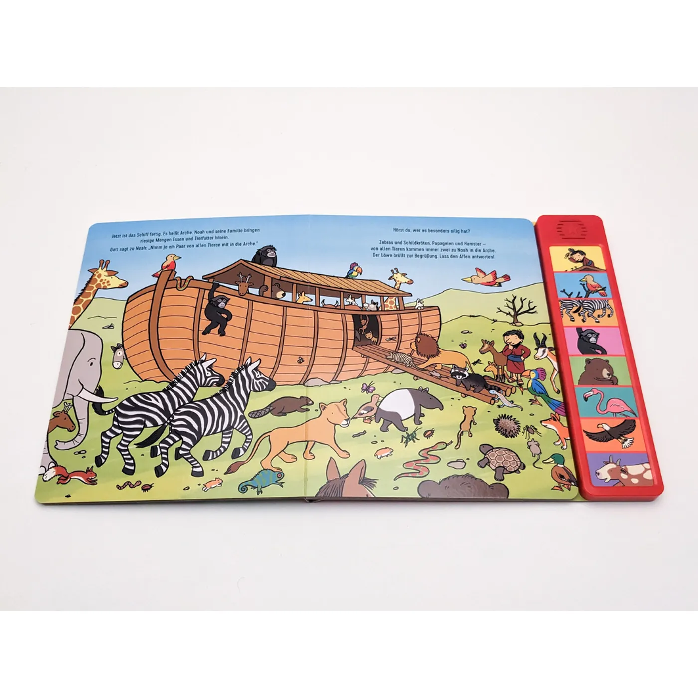 „Die Arche Noah – Mein Soundbuch“ erzählt spielerisch und kindgerecht die biblische Geschichte von Noah und der Arche. Auf Knopfdruck wird die Geschichte für die Kinder lebendig. Die Bilder auf den acht Soundchips kann man innerhalb des Buches wiederfinden, sodass die Kinder die Geschichte nicht nur vorgelesen bekommen und die verschiedenen Sounds hören, sondern auch aktiv mitraten und mitsuchen können.