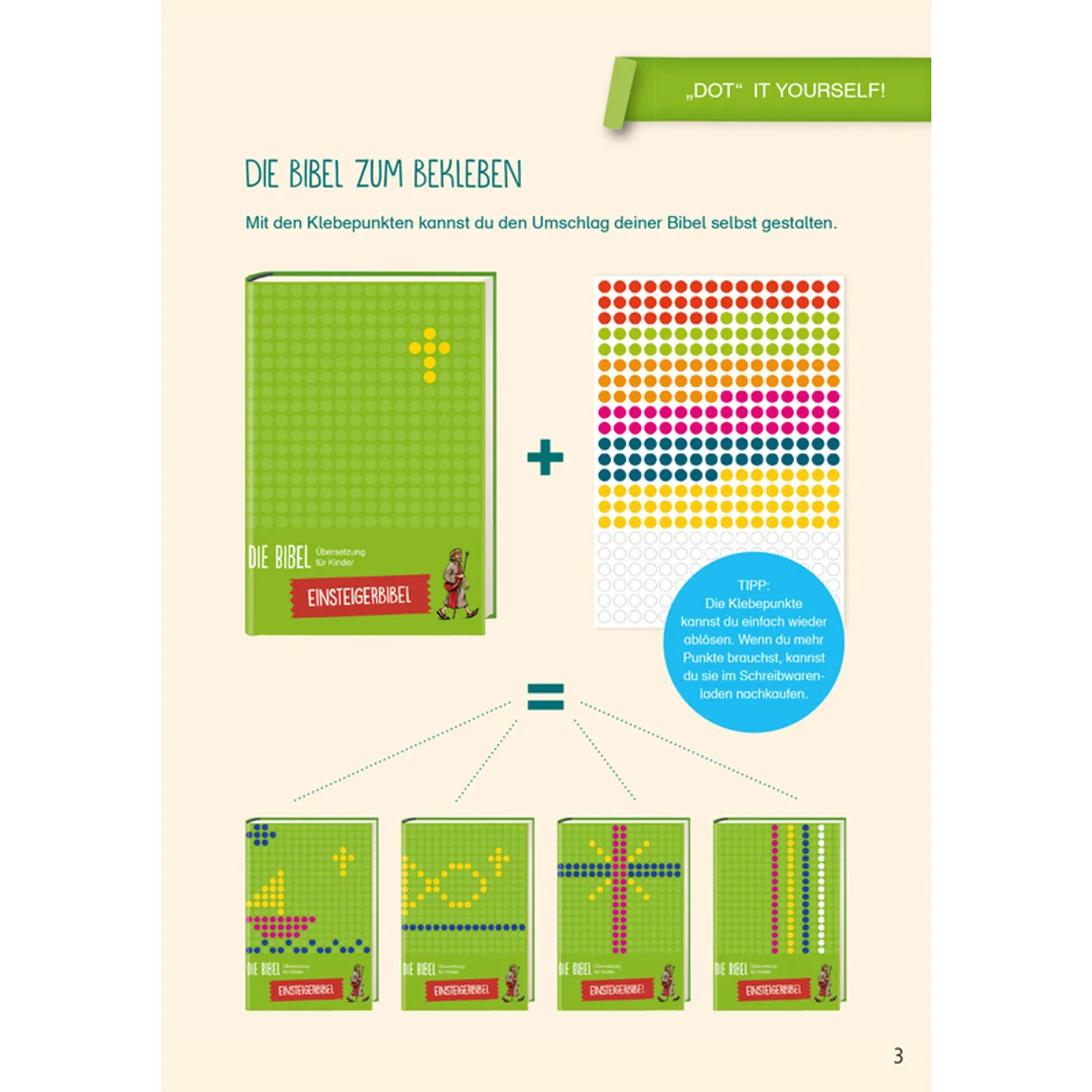 "Einsteigerbibel" nennt sich die neue Bibelausgabe für Kinder von Dr. Andreas Käser und Dr. Christian Brenner. Das Buch enthält die wichtigsten biblischen Erzählungen in einer kindgerechten Sprache. Das beinhaltet kurze Sätze, die Erklärung schwieriger Begriffe und eine schöne Aufmachung mit vielen Fotos und kleinen Erklärkästchen. Das Cover ist in einem leuchtenden Grün gehalten und wirkt auf den ersten Blick etwas langweilig, doch beim Aufschlagen der Bibel entdeckt man innen farbige Klebepunkte mit denen das Kind seine eigene Covergestaltung durchführen und immer wieder verändern kann. Die biblischen Texte sind gut lesbar und wie ich finde eine gelungene Mischung zwischen getreuer Wiedergabe des Inhaltes und verständlicher Sprache für Kinder in der heutigen Zeit. Ich habe schon oft in meiner Arbeit als Religionspädagogin vereinfachte biblische Texte für Gottesdienste oder den Unterricht gesucht und diese neue Einsteigerbibel wird mir sicher hierbei sehr hilfreich sein.