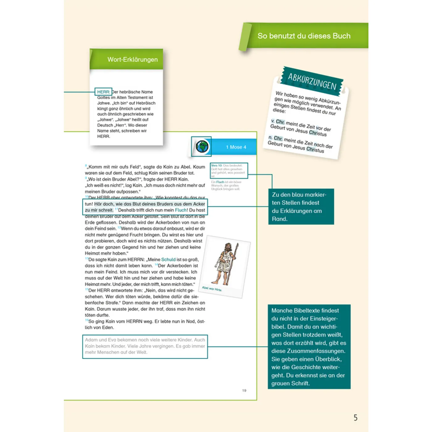 Schon jetzt ist diese Einsteigerbibel von den ausgewählten Texten sehr umfangreich, doch es sind nicht alle Texte einer vollständigen Bibel enthalten. Für den Zusammenhang wichtige Bibeltexte, die nicht enthalten sind, werden in einer kurzen Zusammenfassung wiedergegeben. Schwierige oder unbekannte Wörter sind in den Bibeltexten farblich hervorgehoben und werden am Rand entweder in kurzen Sätzen oder anhand von Fotos erläutert.