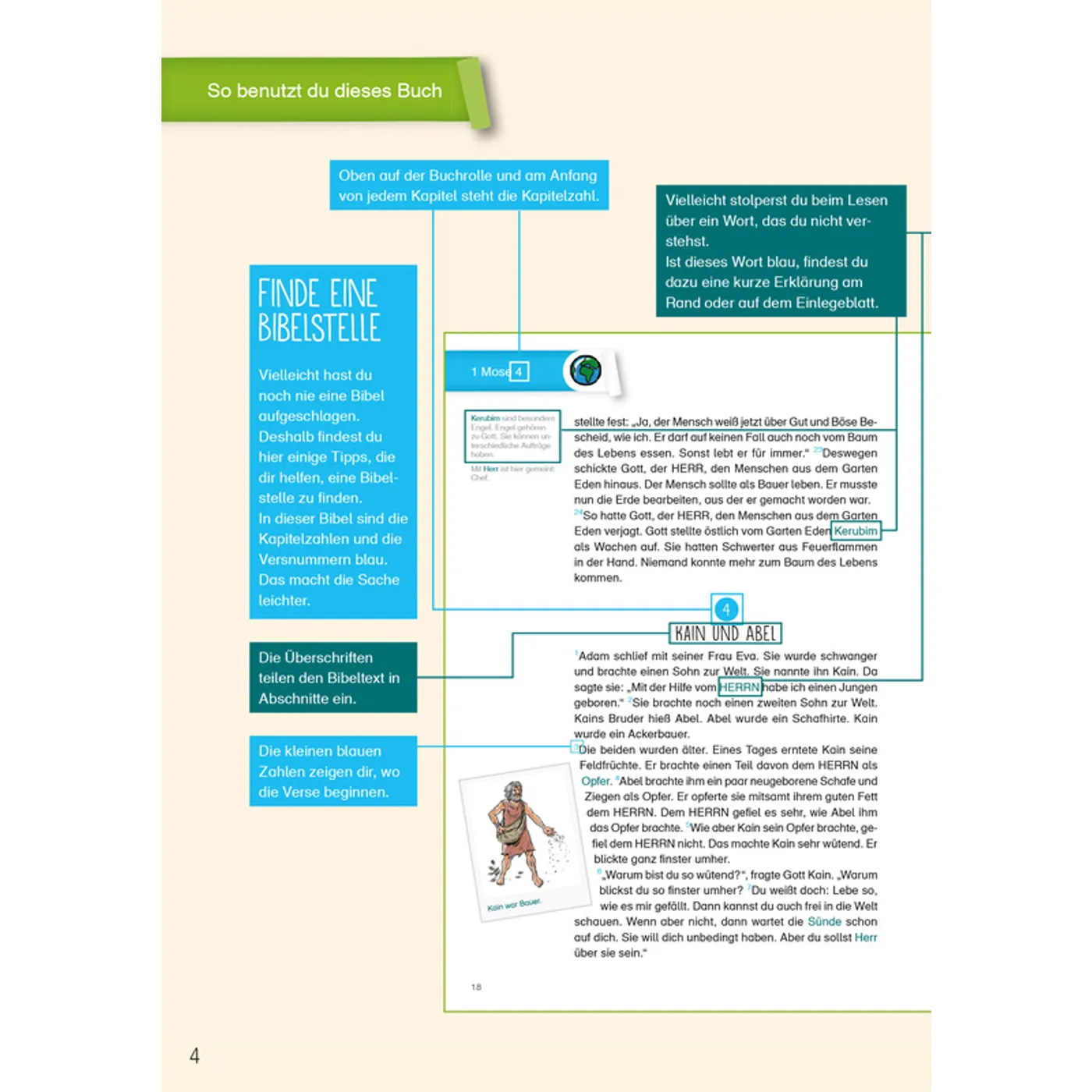 Den eigentlichen Bibeltexten vorangestellt ist eine Doppelseite, wie die Kinder sie bereits aus den Schulbüchern kennen. Hier wird die Benutzung des Buches erläutert und die Leser/innen können sich leichter in den Bibeltexten orientieren.