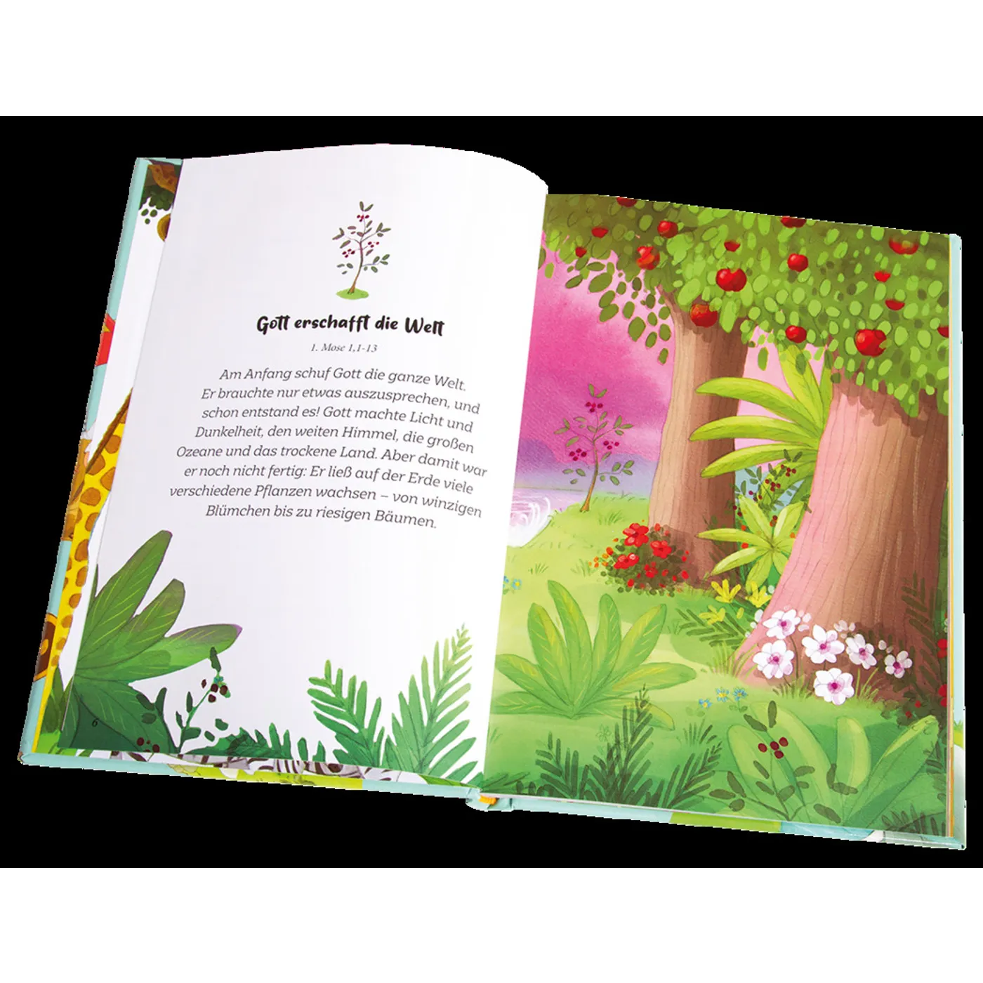 Jede Doppelseite ist einer Geschichte gewidmet. Die Schöpfung, das Leben Jesu und ein paar andere Geschichten werden über mehrere Seiten erzählt. Zu jeder Geschichte sind auch die Bibelstellen vermerkt, so dass man sie in der Bibel nachlesen kann. Insgesamt sind es 45 kurze Geschichten.