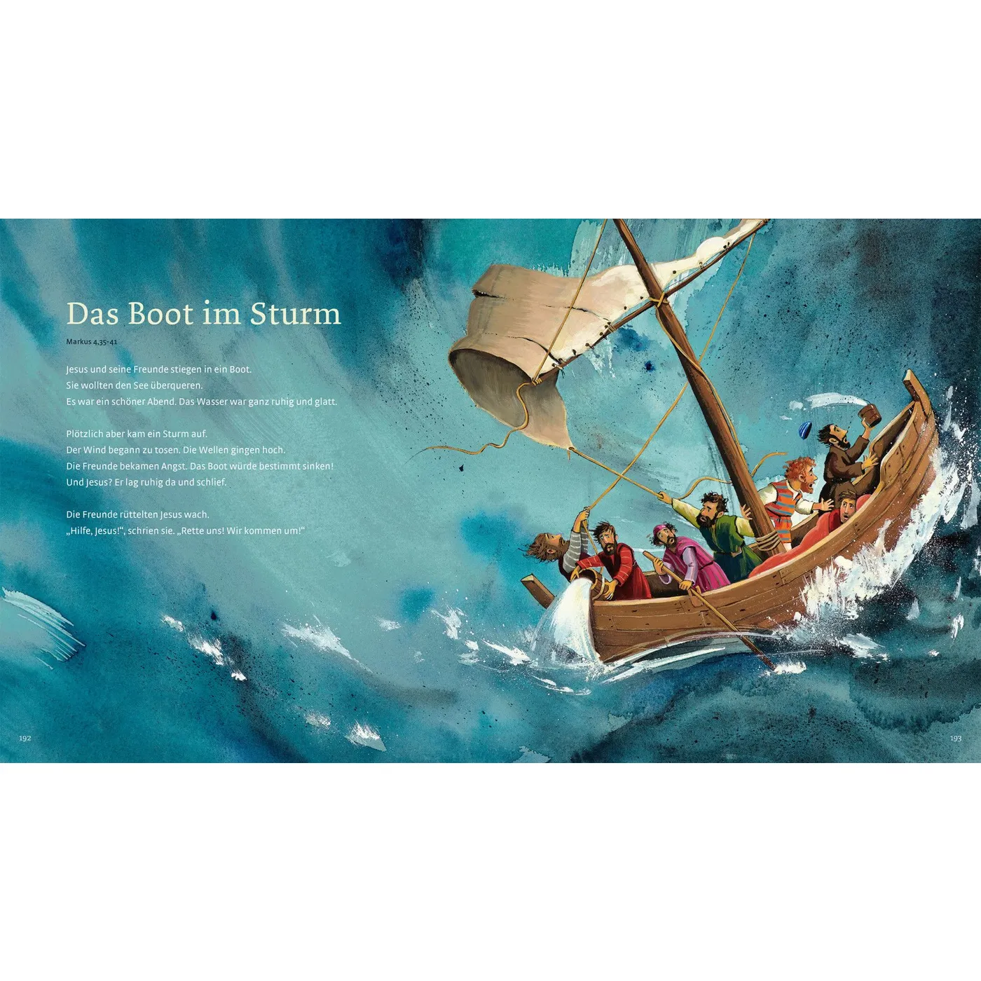 Die große Bibel für Kinder ist eine ganz besondere Bibel. Aufgrund der idealen Größe (sie ist recht groß) dieser Ausgabe, kommen die ausdrucksstarken und lebendigen Illustrationen perfekt zur Geltung. Das Hardcover ist bunt und schön, es zeigt einen Apostel auf einem Boot im türkisfarbenen Meer und eine bunte Menschenmenge die ihm zuwinkt. Die Seiten des Buches sind besonders stark und hochwertig.