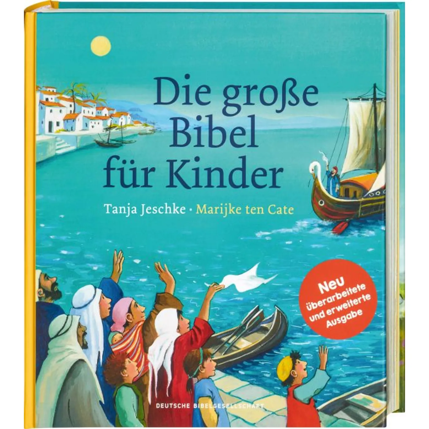 "Die große Bibel für Kinder" ist beim Verlag der deutschen Bibelgesellschaft in einer neu überarbeiteten und erweiterten Ausgabe im Oktober vergangenen Jahres erschienen. Das gebundene, großformatige Hardcoverexemplar umfasst insgesamt 288 Seiten und ist auf die Zielgruppe von Kindern ab ca. 4 Jahren ausgerichtet. Gleich das farbenfroh gestaltete Coverbild zeigt einen Apostel auf einem Boot und eine bunte, ihm zuwinkende Menschenmenge.
