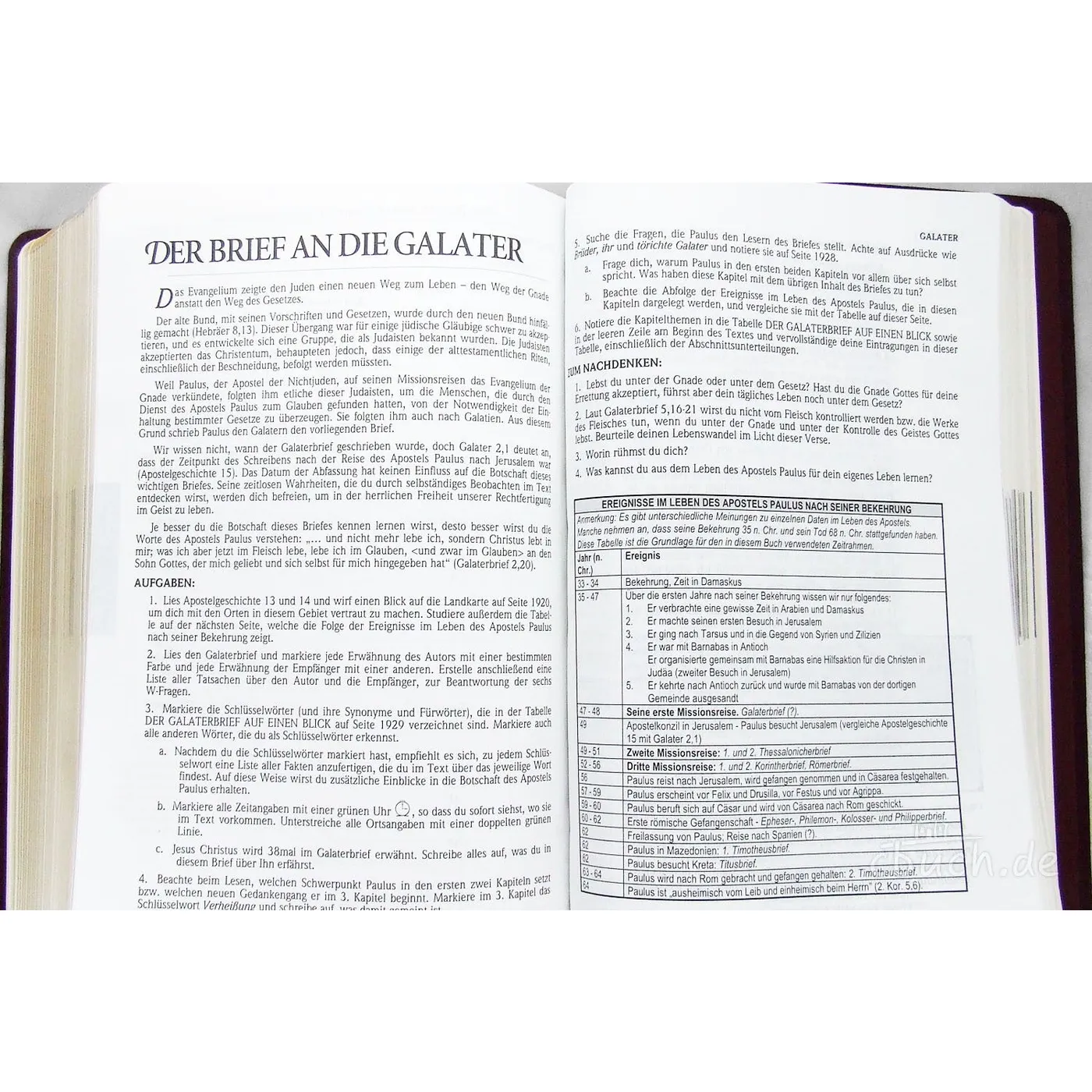 Zu Beginn eines Bibelbuches werden zahlreiche Fragen aufgeworfen, die sich durch die Lektüre selber erschlossen werden sollen. Positiv daran ist die Schärfung des persönlichen Blicks auf Schlüsselstellen in dem jeweiligen Bibelbuch. Des Weiteren bieten die Zusammenfassungen am Ende anhand einer Seite eine gute Strukturierung des Inhaltes auf das Wesentliche. Zahlreiche farbige Abbildungen und Hintergrundinformationen runden das Gesamtwerk ab.