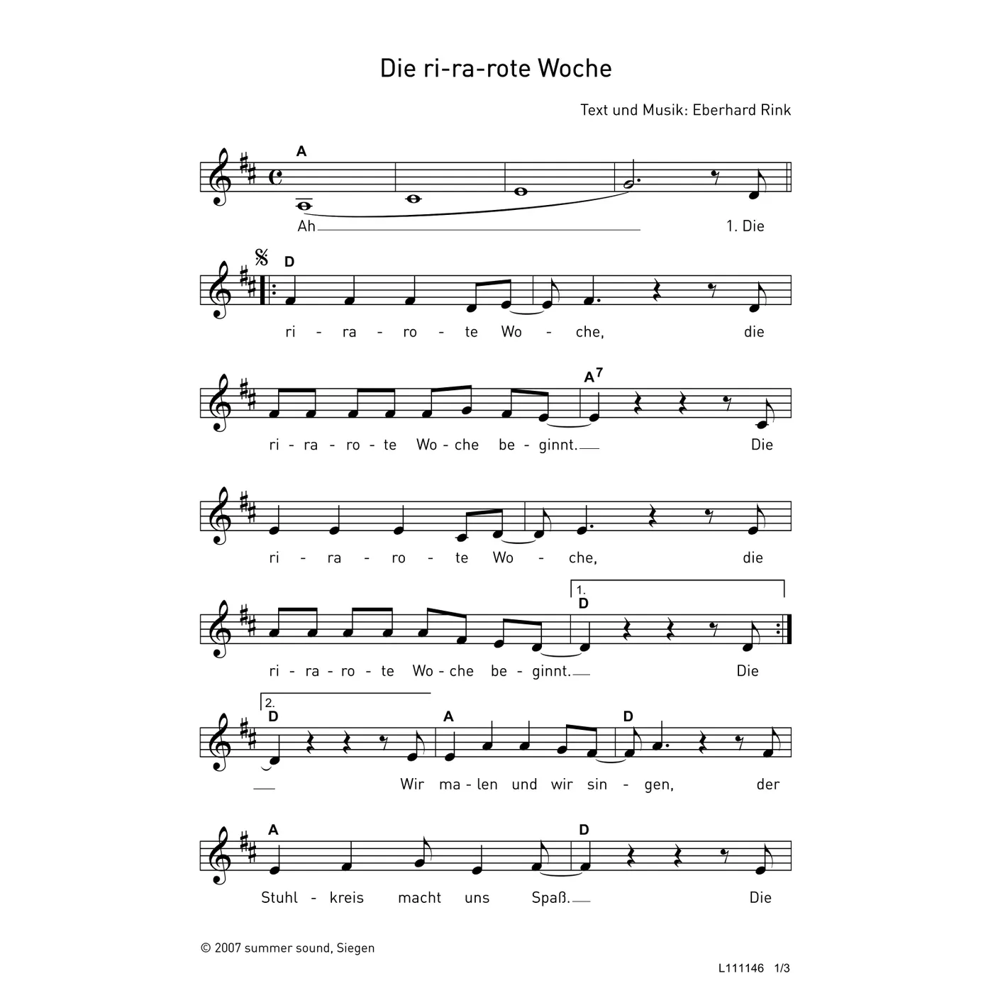 Die ri-ra-rote Woche (diese Variante haben Sie gerade ausgewählt) (einstimmig, mit Akkorden, D-Dur) Eberhard Rink (Komposition, Text) |