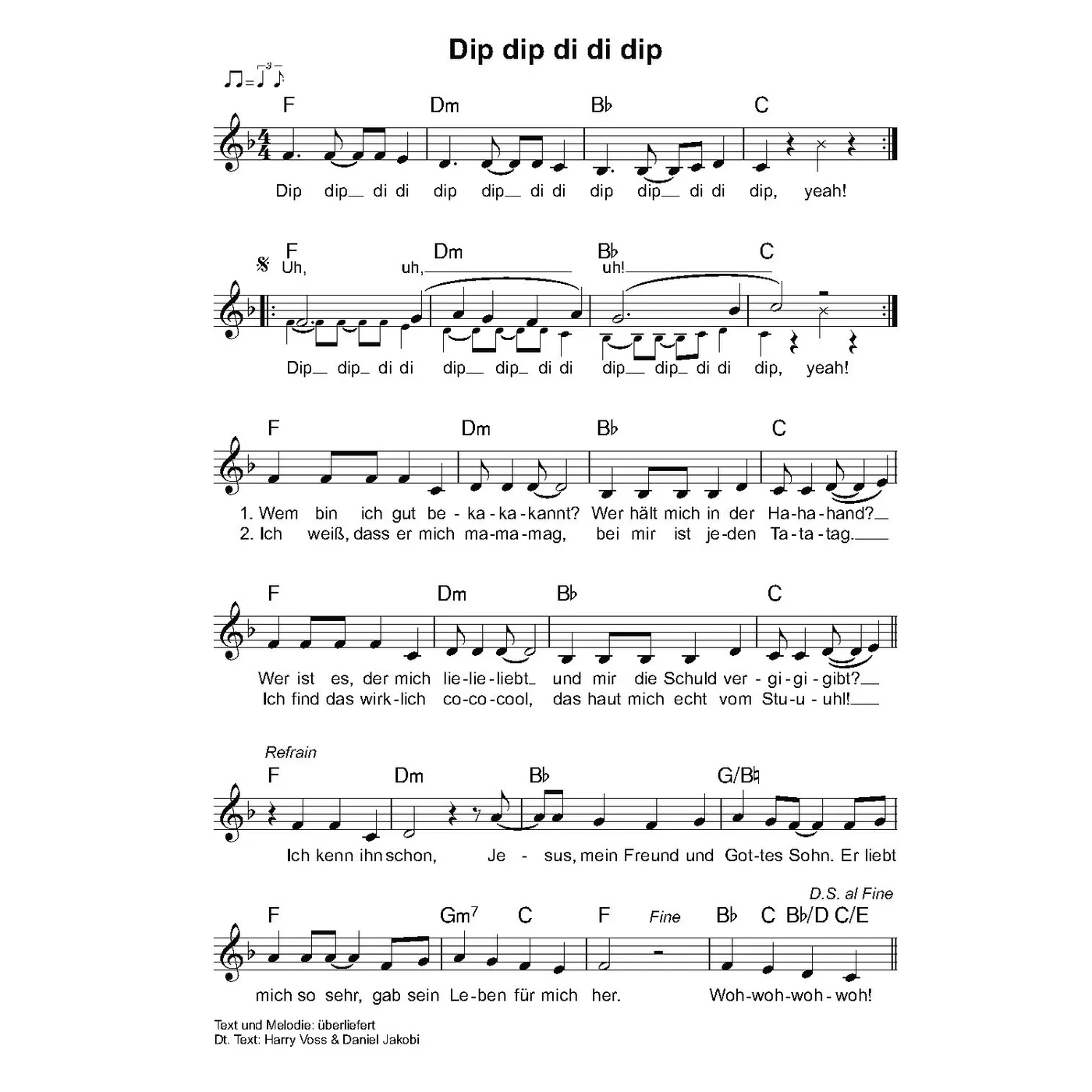 Dip dip di di dip (diese Variante haben Sie gerade ausgewählt) (Kinderlieder, einstimmig) Daniel Jakobi (Dt. Text), Harry Voß (Dt. Text), überliefert (Text, Melodie) |