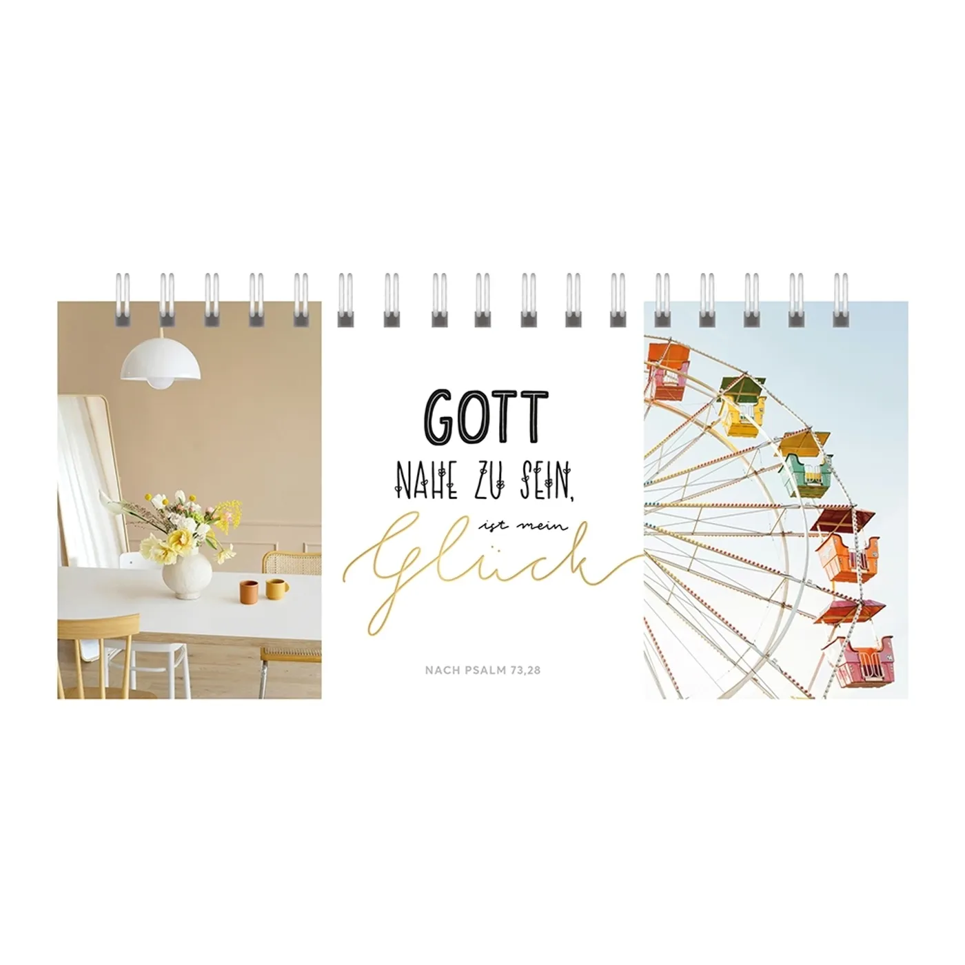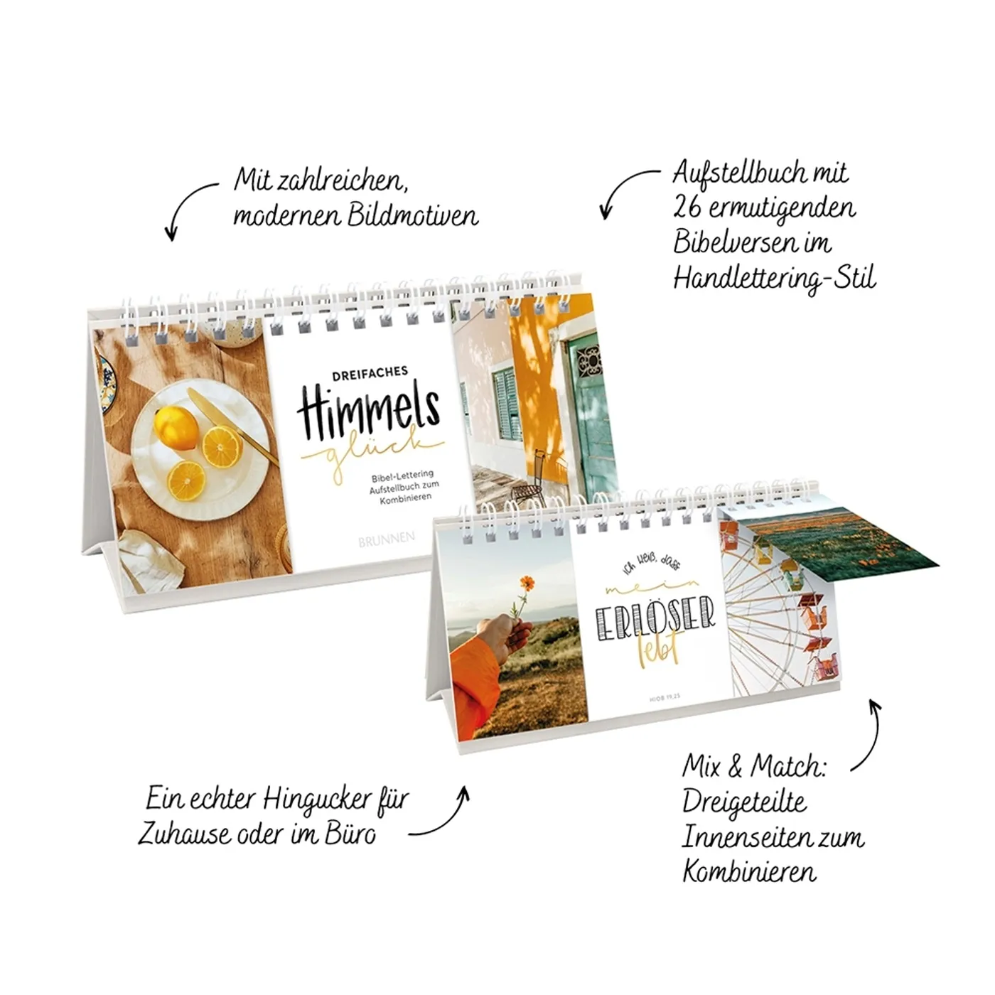 Dieses neue Aufstellbuch verbindet 26 handgeschriebene Bibelverse im beliebten Handlettering-Stil aus den Himmelsglück-Kalendern mit einer frischen Auswahl aus trendigen Bildmotiven. Durch die Dreiteilung sind die Motive frei kombinierbar und es entstehen immer wieder neue, wunderschöne Seiten.