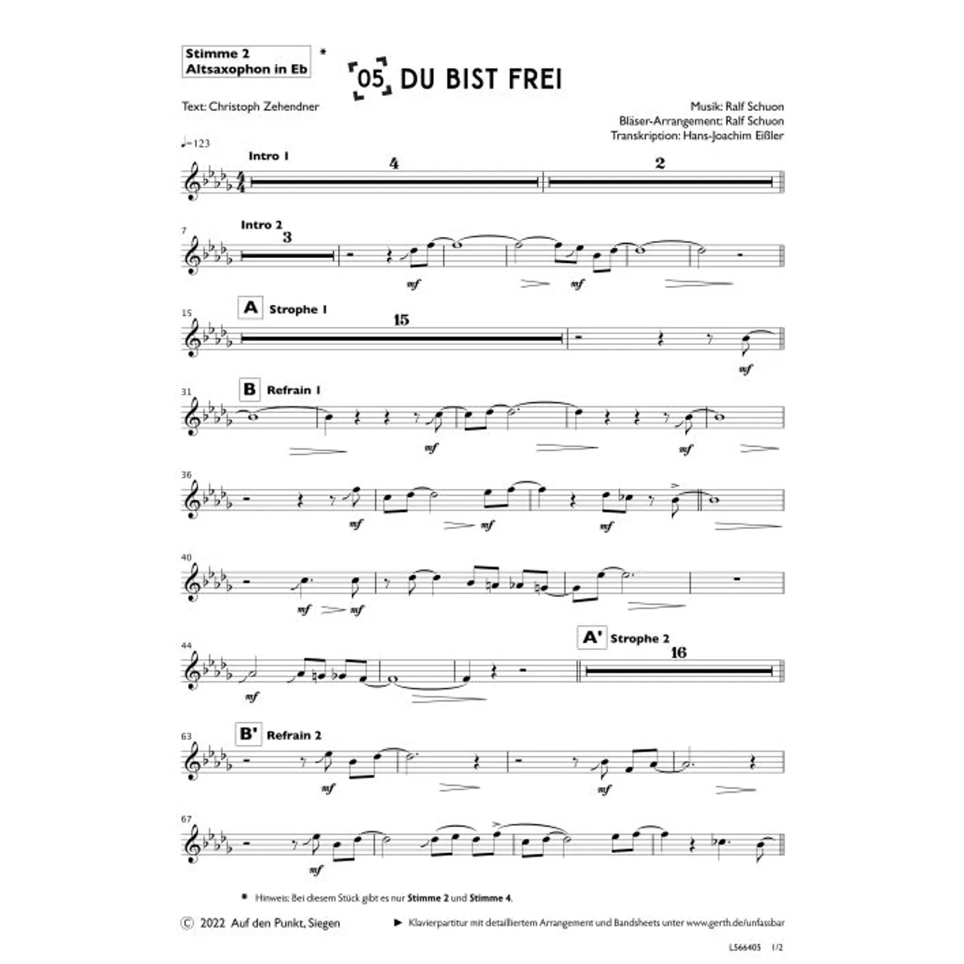 Du bist frei (Altsaxophon in Eb) (diese Variante haben Sie gerade ausgewählt) (Gemeindelied, Bläser, Orchestereinzelstimme, E-Dur) Christoph Zehendner (Text), Hans-Joachim Eißler (Bläsersatz), Ralf Schuon (Komposition, Bläsersatz) |