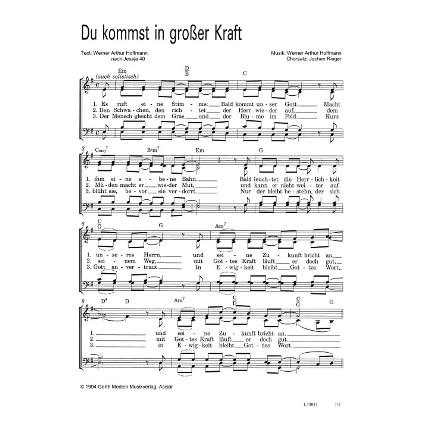 Du kommst in großer Kraft (diese Variante haben Sie gerade ausgewählt) (traditionell, gemischter Chor, mit Akkorden, vierstimmig, E-Moll) Werner A. Hoffmann (Komposition, Text), Jochen Rieger (Bearbeiter) |