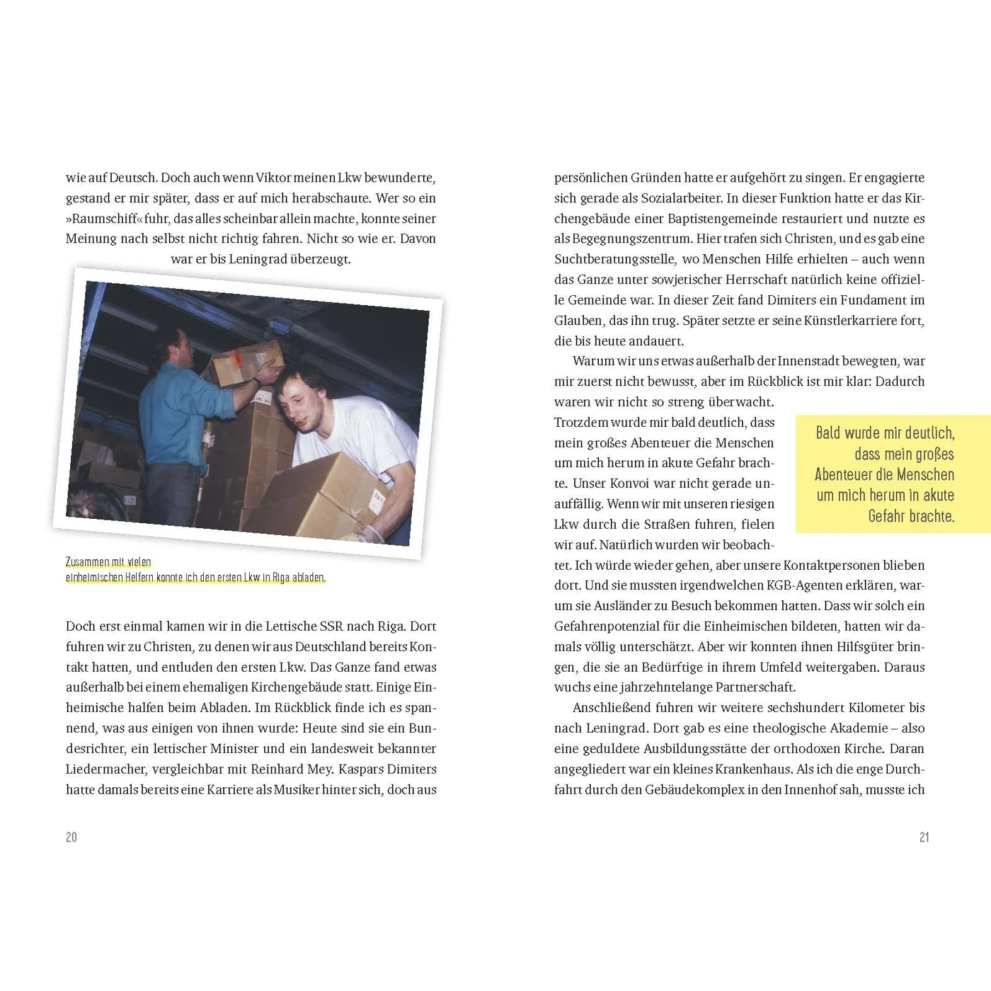 Er erzählt unglaublich mitreißend und lebendig von seinen Erlebnissen, von seinen Fahrten in aller Herren Länder, um Hilfsgüter zu transportieren. Er berichtet von seinen Erfahrungen mit der Mafia, von Wundern an Grenzübergängen und von unglaublichen Gebetserhörungen.